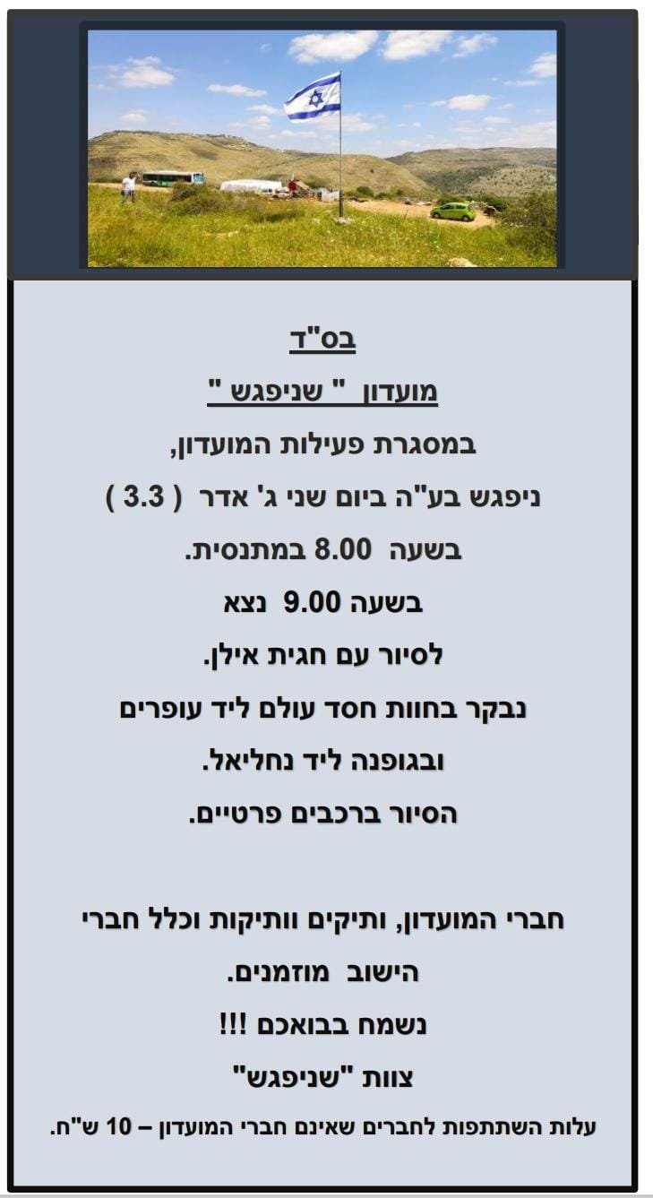 ביום שני ג' אדר (3.3) ניפגש בע"ה בשעה 8.00 במתנסית. לאחר תכנית הבוקר הרגילה, נצא בשעה 9.00 לסיור ברכבים פרטיים בהדרכת חגית אילן. נבקר בחוות "חסד עולם" ליד עופרים וב"גופנה" שליד נחליאל.
