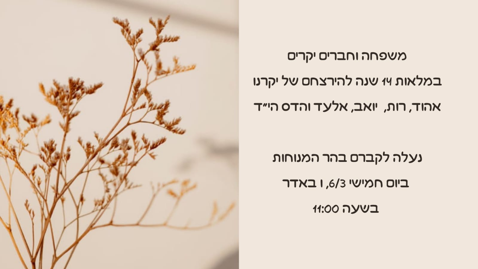 • משפחה וחברים יקרים, במלאת 14 שנה להירצחם של יקרינו, אהוד, רות, יואב והדס הי"ד. נעלה לקברם בהר המנוחות ביום חמישי 6.3, ו באדר, בשעה 11.00