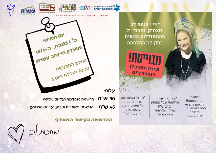 מופע מגוייסות- נשים יקרות, אנחנו נרגשות להזמין אתכן למופע "מגוייסת" מופע מצחיק, נוגע, עוצמתי ומרגש עד דמעות, שמעניק עיבוד, אוויר ונשימה לכל מה שעברנו בשנתיים האחרונות. המופע מספר מנקודת מבט של אשת מגויס, אך מדבר אל כל אישה שחוותה את התקופה הזו בארץ לאו דווקא מתוך הגיוס עצמו. זהו ערב שממנו יוצאים עם תקווה, כוח ותחושת חיבור עמוקה. לו"ז הערב: 20:00 – התכנסות 20:30 – תחילת מופע מיקום: מועדון היישוב עטרת. עלות והרשמה: 45 ש"ח. ניתן לבטל את ההרשמה ללא עלות עד יום חמישי, י"ט בטבת (8.1).