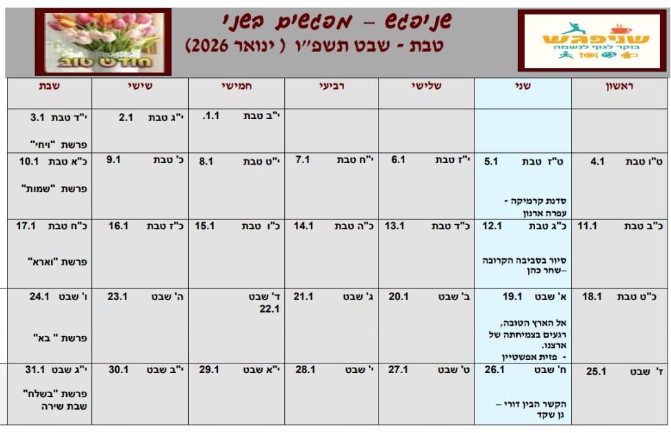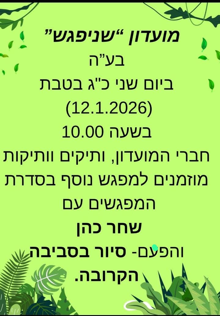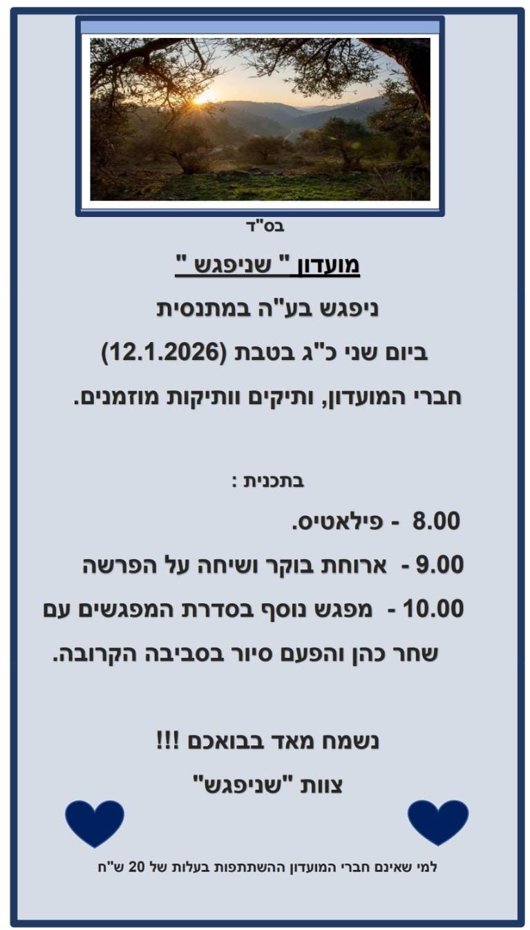שנשמע בע"ה רק בשורות טובות. נשמח בבואכם, צוות "שניפגש". ההשתתפות למי שאינם חברי המועדון בתשלום של 20 ש"ח.
