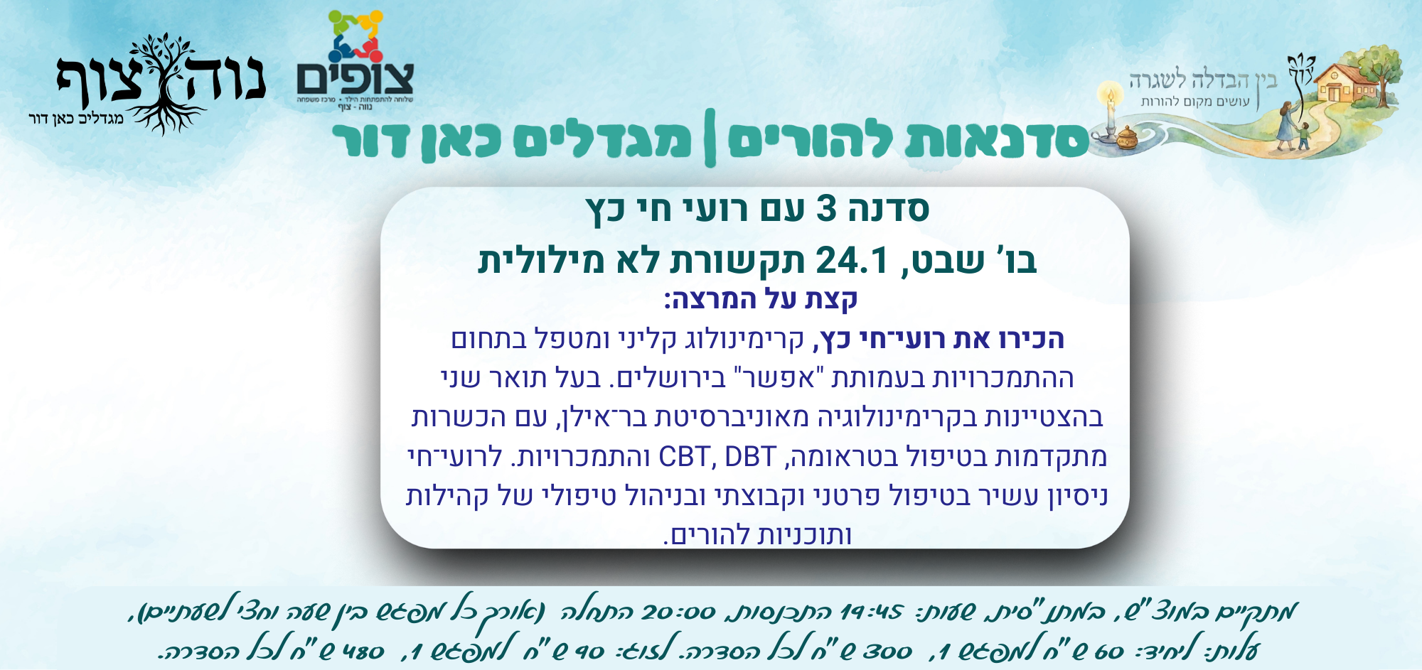 שנשמע בע"ה רק בשורות טובות. נשמח בבואכם, צוות "שניפגש". ההשתתפות למי שאינם חברי המועדון בתשלום של 20 ש"ח.