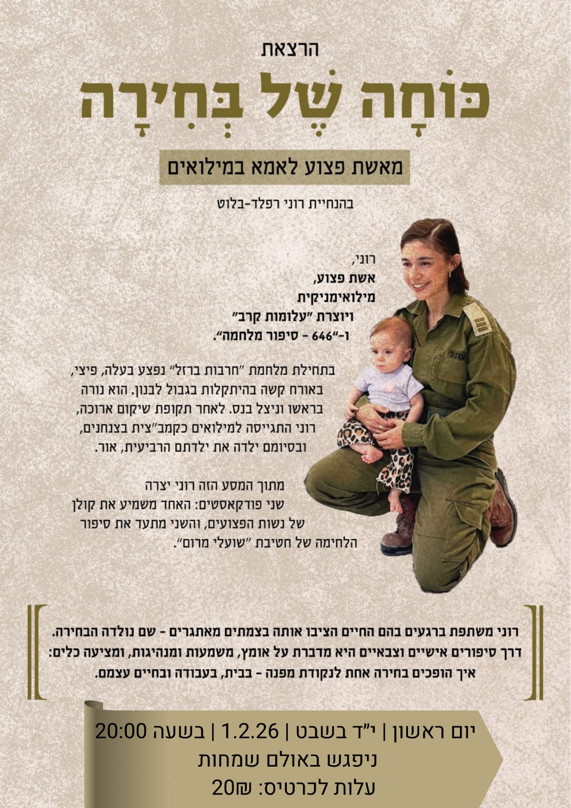 ערב טו בשבט• 🌱 מכאן צומחים – כוחה של בחירה- ביום ראשון הקרוב | י״ד בשבט | 1.2.26 | בשעה 20:00. ניפגש באולם שמחות לערב מיוחד עם רוני רפלד בלוט– אשת פצוע, מילואימניקית, ויוצרת הפודקאסטים ״עלומות קרב” ו־״646 – סיפור מלחמה”. מתוך המלחמה, ומתוך החיים עצמם, נולדה ההרצאה ״כוחה של בחירה”. הרצאה שמדברת על הרגעים שבהם אין תשובות ברורות אבל יש בחירה. בחירה איך להמשיך לנוע קדימה בתוך מציאות מורכבת, ואיך החלטות אישיות ומקצועיות מעצבות חוסן, זהות ודרך. ערב של הקשבה, מחשבה, חיבור, וכוח שנולד דווקא מהמקומות המאתגרים.🎟️ עלות כרטיס: 20 ₪. להרשמה לחצו כאן! נשמח לראותכם.