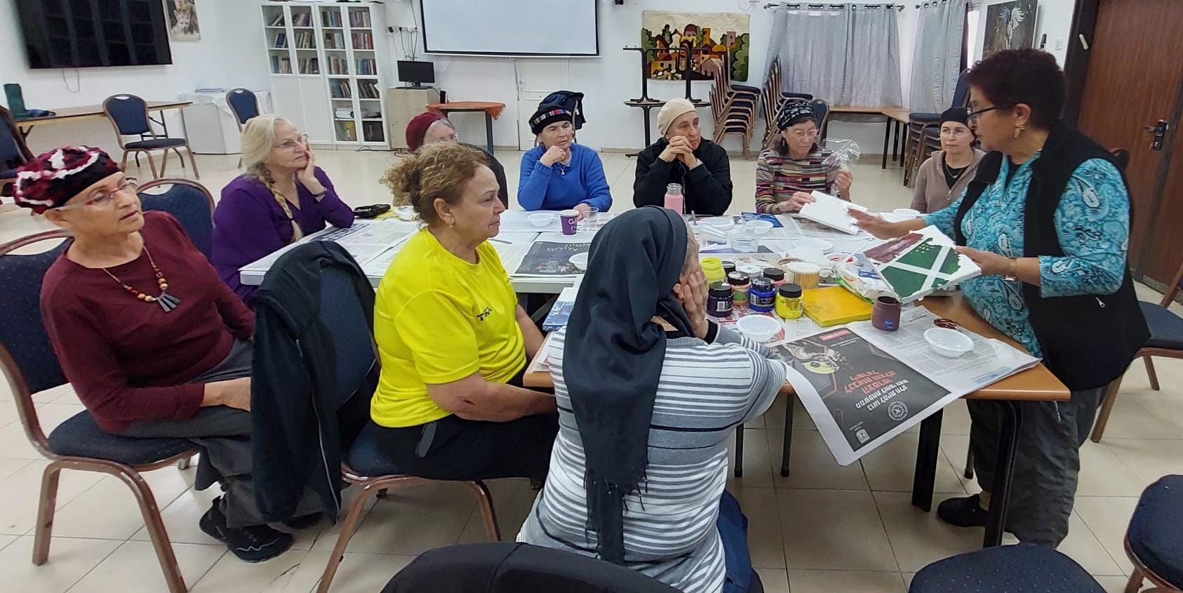 נפגשנו במתנסית ביום שני ח' בשבט (26.1). לאחר פעילות הבוקר הרגילה, חברתנו חבצלת רוז המדהימה העבירה לנו סדנת יצירה. סדנת ציור, צביעה על קנבס.