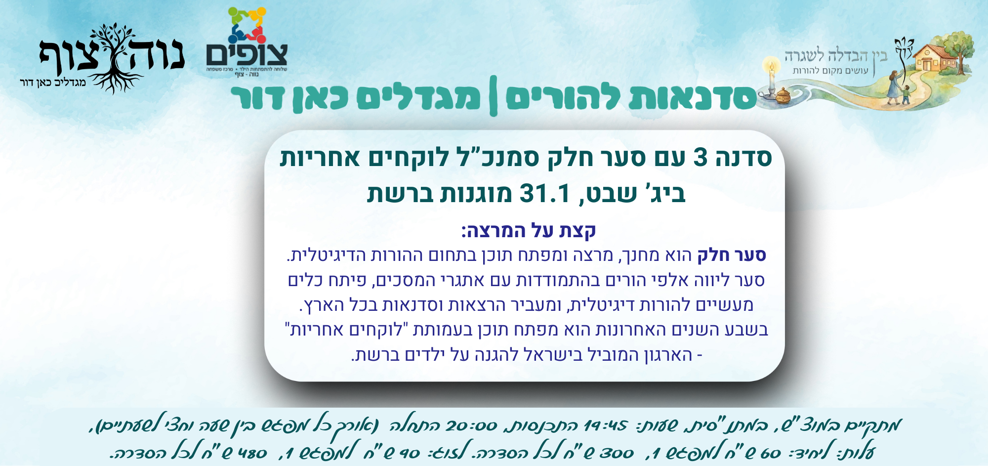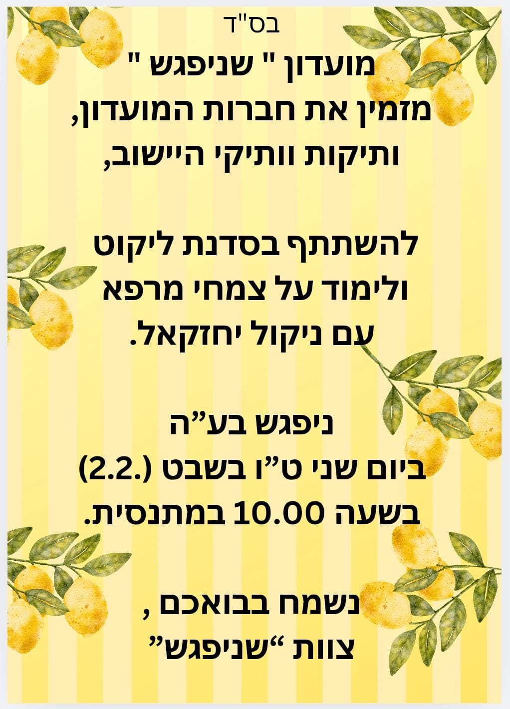 שנשמע בע"ה רק בשורות טובות. נשמח בבואכם, צוות "שניפגש". ההשתתפות למי שאינם חברי המועדון בתשלום של 20 ש"ח.