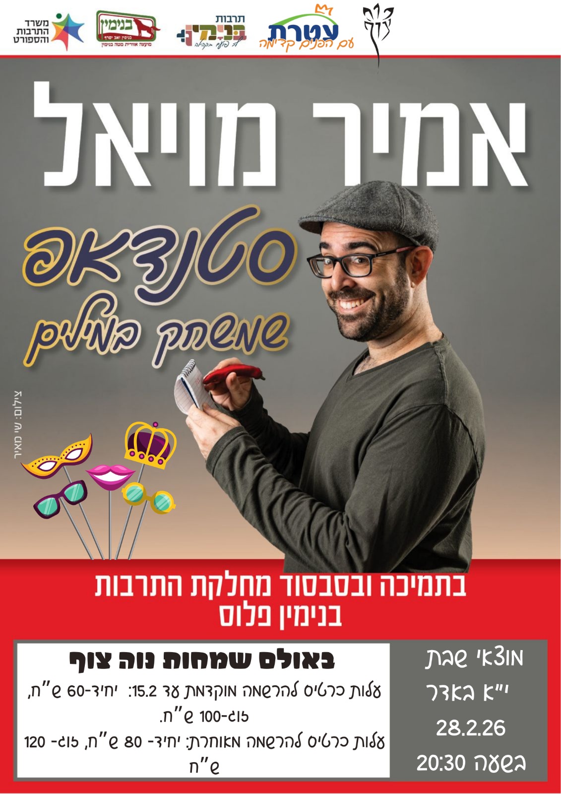 🌶️חריף, שנון וקורע מצחוק, אמיר מויאל מגיע לנוה צוף! מוצ"ש של צחוק בקהילה, אירוע שאסור לפספס! 🎭 אמיר מויאל במופע סטנדאפ "שעוסק במילים" (אבל בעיקר גורם לכם לצחוק בקול). מתאים לכולם! באתם כזוג? מעולה. 👩🏻🤝👨🏾 באתם עם חבר או חברה? עוד יותר טוב. 👯♀️ העיקר שתצאו מהבית ותבואו ליהנות. 🤝 איחוד כוחות: תושבי נוה צוף ותושבי עטרת נפגשים באולם אחד. יהיה מעניין (ומצחיק) לראות את הדינמיקה… 😉 ⏳ שימו לב לדד-ליין! המחיר עולה ב-15.2 פרטים טכניים:📅 תאריך: 28.2.26 (י"א באדר) 🕗 שעה: 20:30 📍מיקום: אולם שמחות נוה צוף 💵 מחירים: עד 15.2: יחיד 60 ₪ | זוג 100 ₪ אחרי 15.2: יחיד 80 ₪ | זוג 120 ₪ לרכישת כרטיסים >>