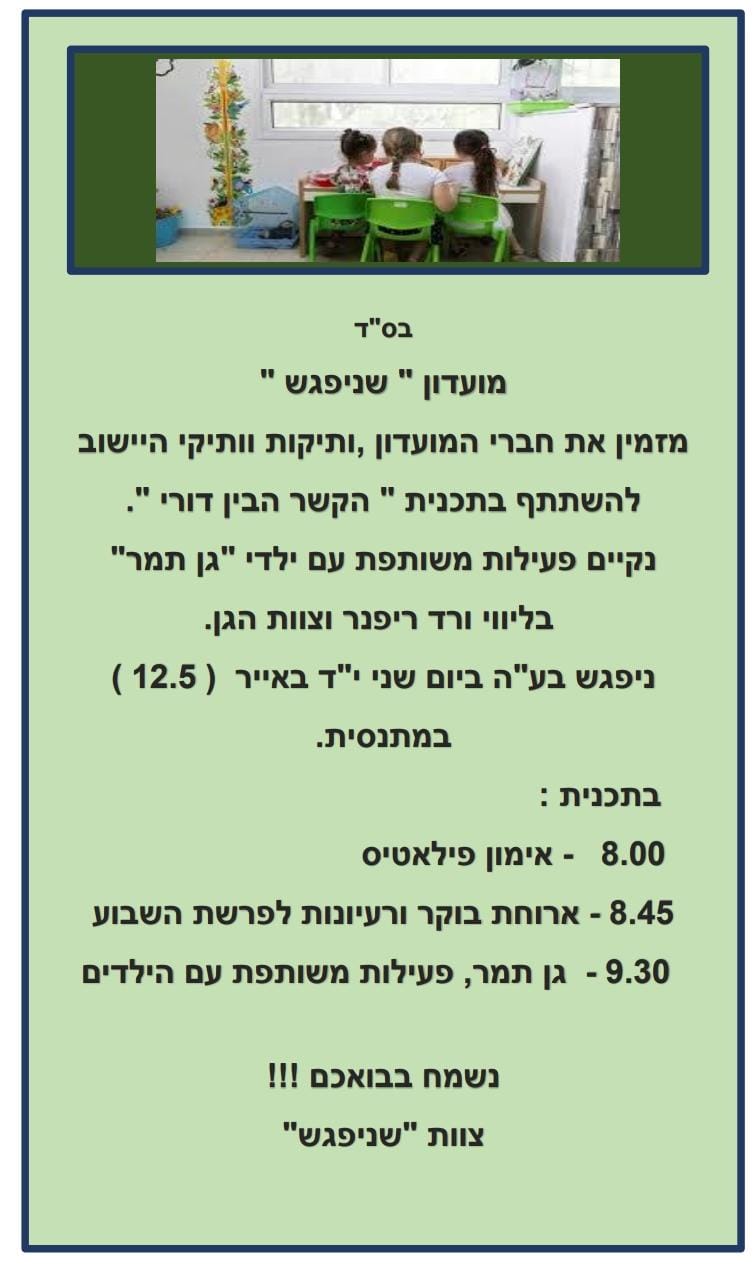 בתוכנית- 8.00 – אימון פילאטיס, 8.45 – ארוחת בוקר ושיחה על פרשת השבוע., 9.30 – נלך לפגוש את ילדי גן תמר לפעילות משותפת במסגרת פעילות הקשר הבין דורי.