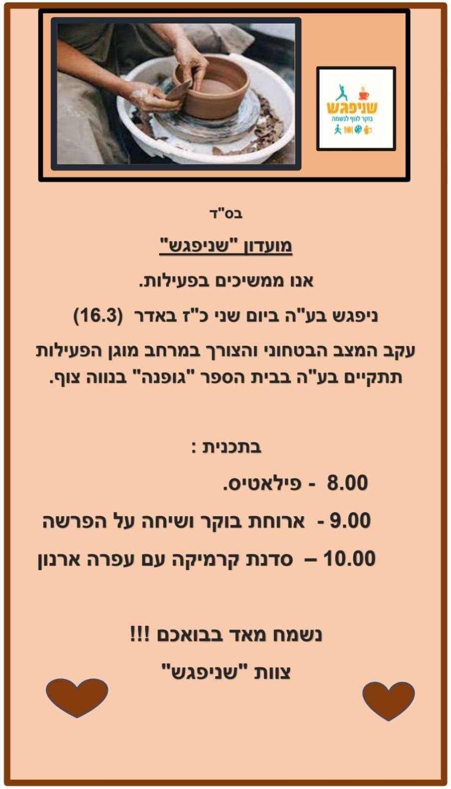 כ"ז באדר (16.3). נתחיל באימון פילאטיס, נמשיך בארוחת בוקר ושיחה על פרשת השבוע. בשעה 10.00 נקיים סדנת קרמיקה עם עפרה ארנון. המפגש יתקיים בביה"ס "גופנה".