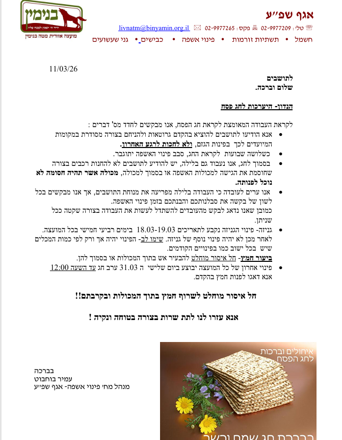 קמחא דפסחא תשפ"ו- כבכל שנה נתחיל באיסוף "קמחא דפסחא". חשוב לציין שהכסף שנאסף מיועד למשפחות בתוך הישוב ע"פ קריטריונים של ועדת חברים.