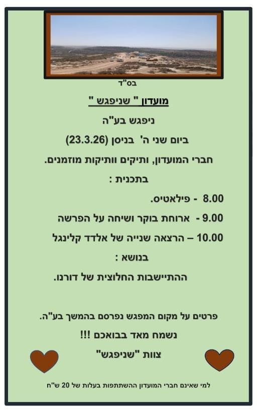 נתחיל באימון פילאטיס, נמשיך בשיח חברות על פרשת השבוע . בשעה 10.00 יגיע אלינו אלדד קלינגל להרצאה שנייה בנושא – "ההתיישבות החלוצית של דורנו".