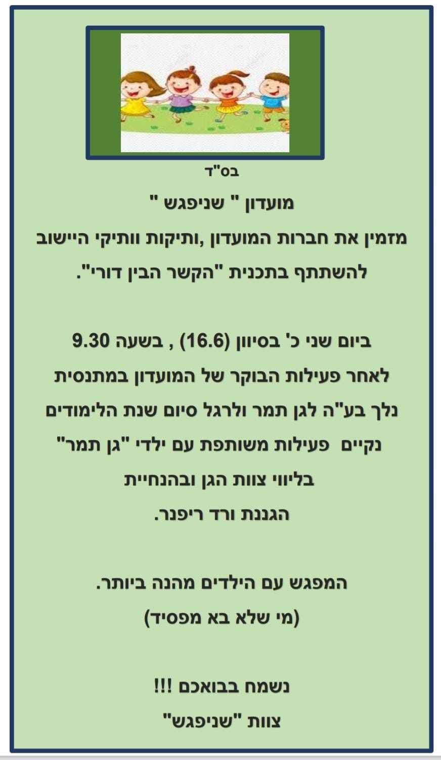 8.00 – אימון פילאטיס, 8.45 – ארוחת בוקר ודברי תורה לפרשת השבוע, 9.30 – במסגרת תכנית "הקשר הבין דורי" נלך לגן תמר לפעילות משותפת עם הילדים לרגל סיום השנה. ותיקים וותיקות אנו מצפים לבואכם. המפגש עם ילדי הגן הוא חוויה מהנה ביותר שגם הילדים וגם אנחנו מחכים לה בשקיקה. חבל להפסיד את המפגש.
