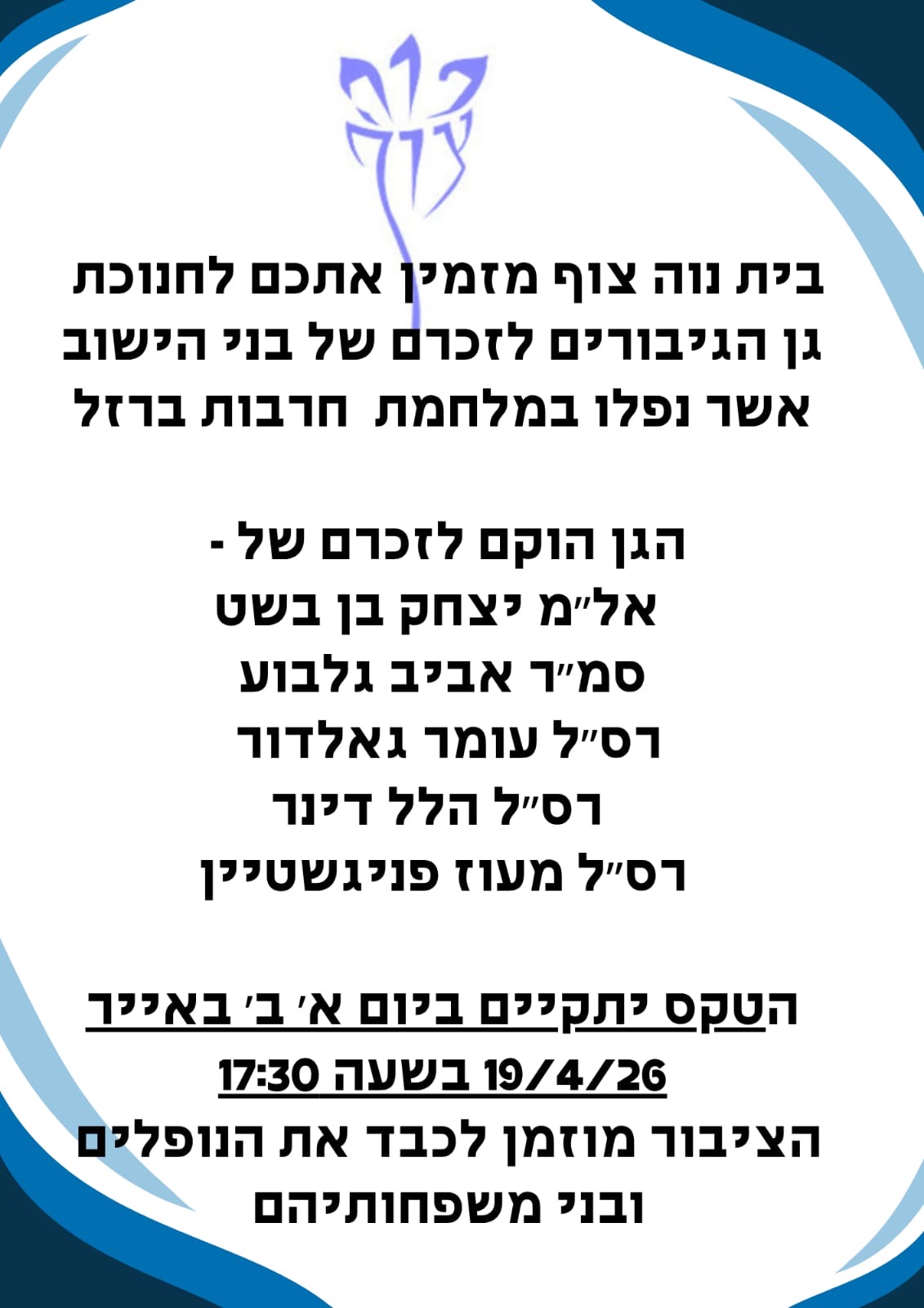 יום הזיכרון ויום העצמאות תשפ"ו- ביום הזיכרון, אנו זוכרים את מסירות הנפש של הנופלים, שהניחה את היסודות לגאולתנו. כשם שבקריעת ים סוף, הים נבקע בזכות מסירות הנפש, כך גם היום אנו זוכים לחיות במדינה מפוארת בזכות גבורתם ואהבתם לארץ. מתוך הרוח הזו, נווה צוף שואפת להמשיך ולצמוח, לבנות ולהתפתח, עם אותה מסירות ושליחות.