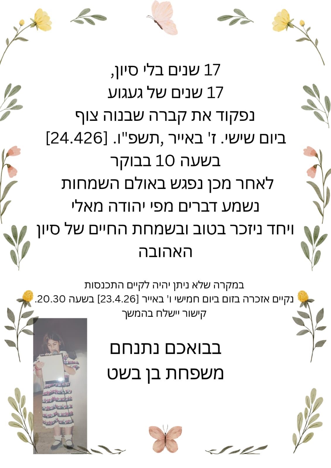 *יום הזיכרון ויום העצמאות- כפי שפרסמנו מוקדם יותר השבוע, אנו עמלים על מציאת פתרונות על מנת לציין ביישוב את יום הזיכרון ולחגוג את יום העצמאות מתוך אחריות לביטחון התושבים ובכפוף להנחיות פיקוד העורף. נא עקבו אחרי הפרסומים לעדכונים שיגיעו.