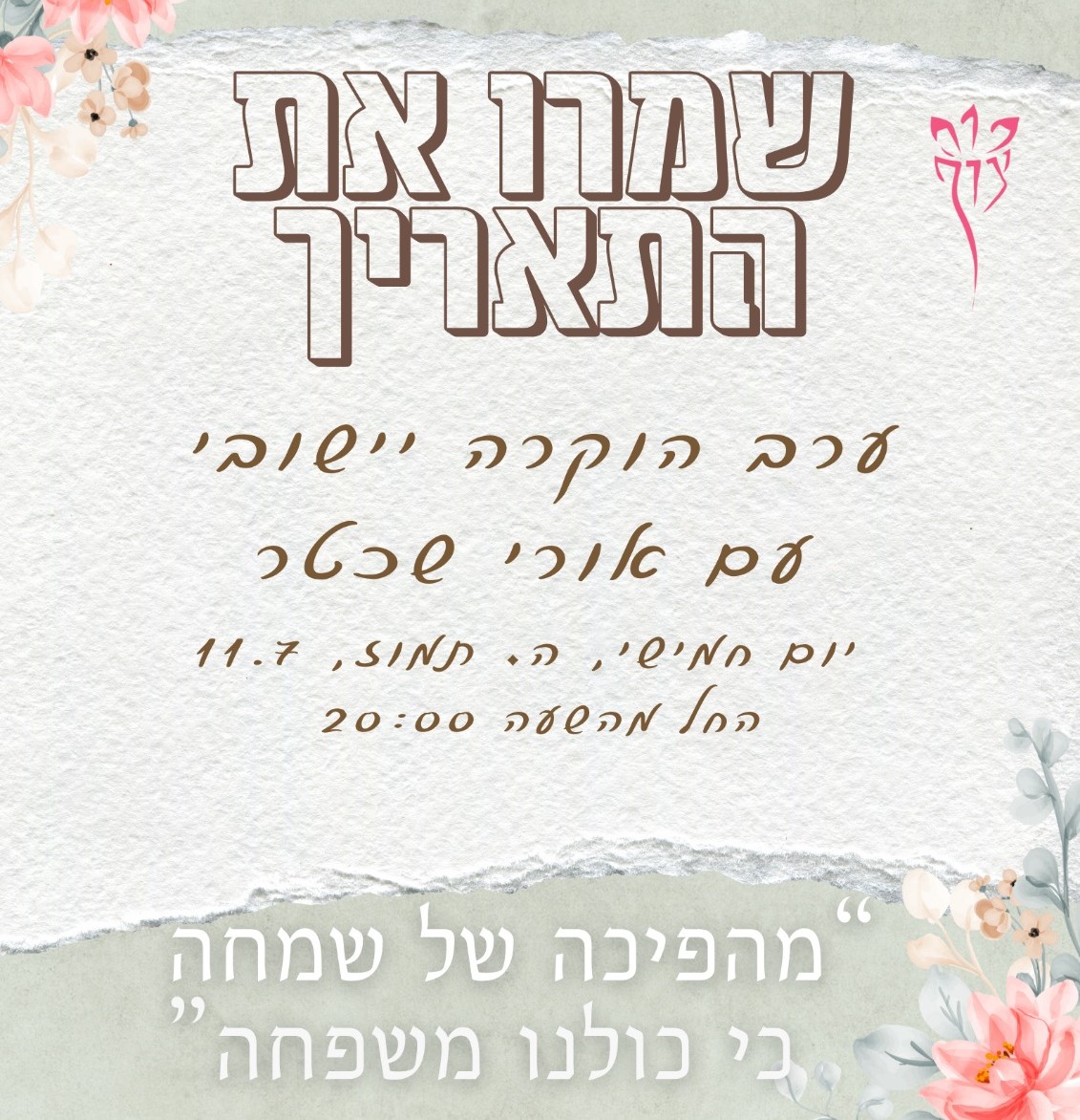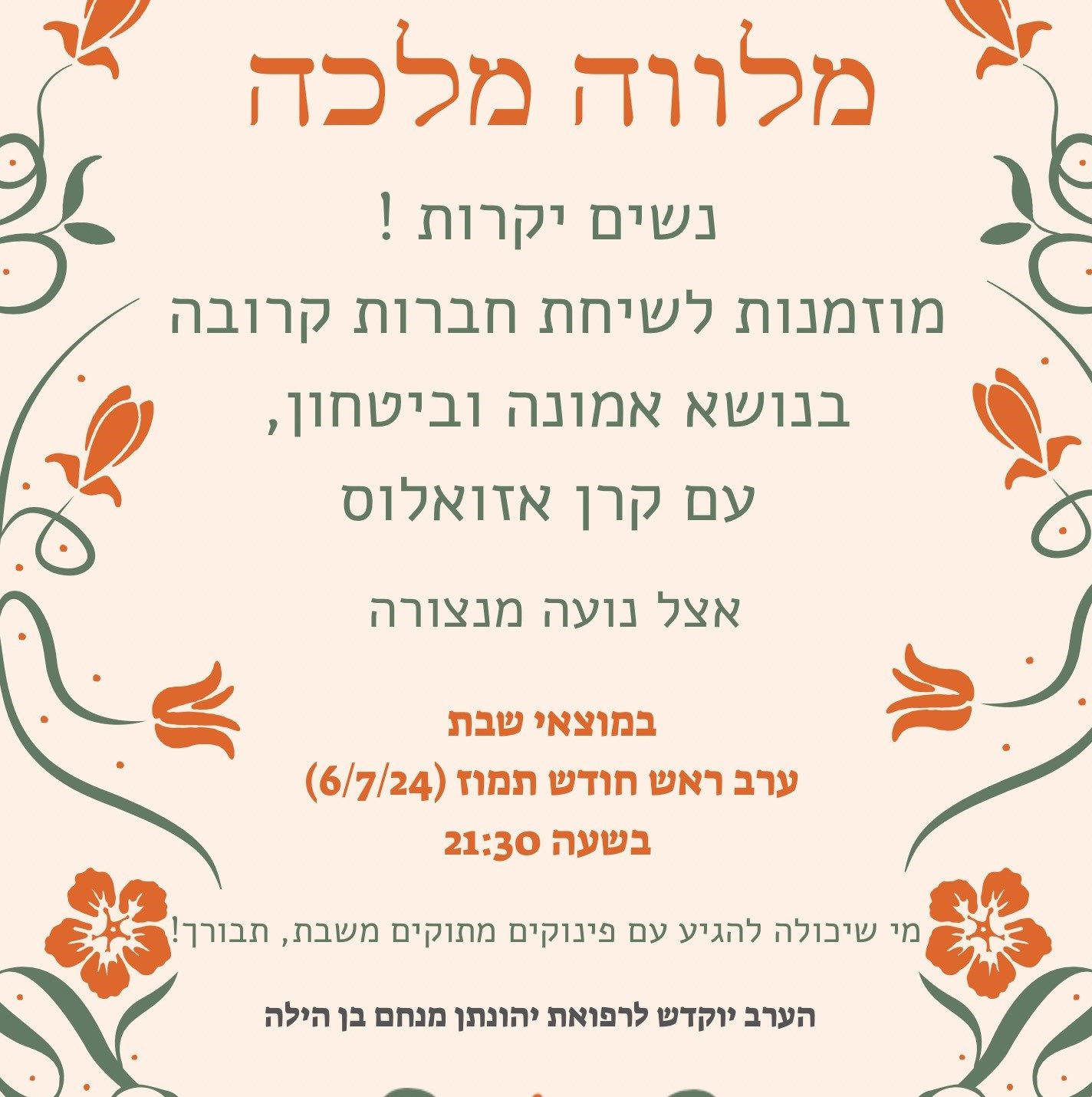 יום שני הקרוב ב' בתמוז 08/07 בשעה 17:00. מחכים לראותכם!👫