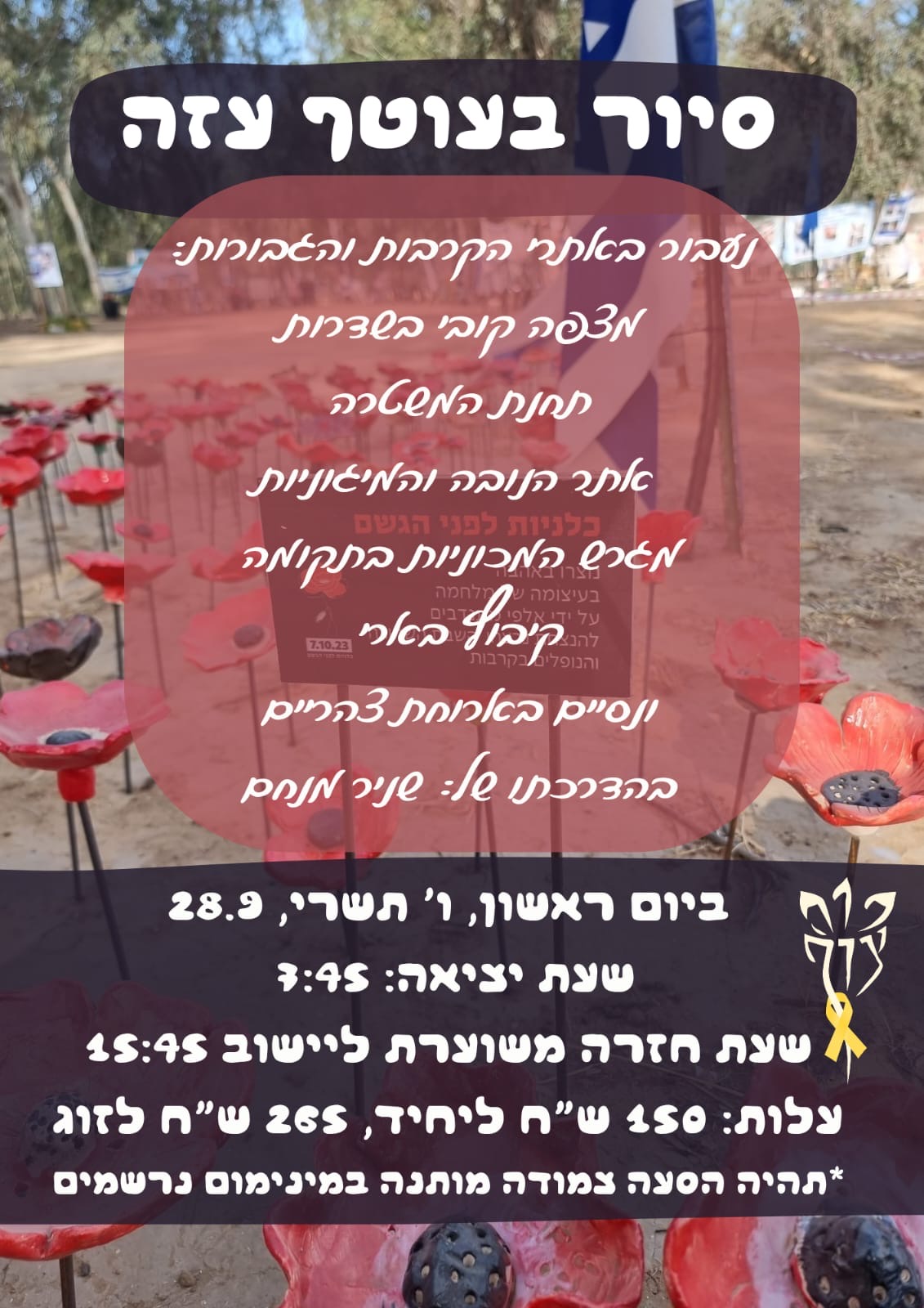 סיור משמעותי בעוטף לזכור, לראות, להתחבר 🇮🇱🌾 לקראת יום השנה למלחמת חרבות ברזל, בחרנו לציין את היום הזה בצורה משמעותית ומעמיקה, דרך מפגש עם האנשים, המקומות והסיפורים שהיו בלב האירועים. הסיור יכלול: 🔹 סיור באתרי קרב וזיכרון 🔹 זמן לעיבוד, חיבור אישי וקהילתי. הסיור בהדרכתו של שניר מנחם נשמח מאוד שתצטרפו אלינו! הסיור פתוח לתושבי היישוב, בהרשמה מראש בלבד. להרשמה לחצו כאן! בואו לקחת חלק ביום של עומק, זיכרון וחיזוק הקשרים בינינו כקהילה. מספר המקומות מוגבל! בברכה, ליאל רפאל רכזת תרבות ורעות משה מנהלת הקהילה