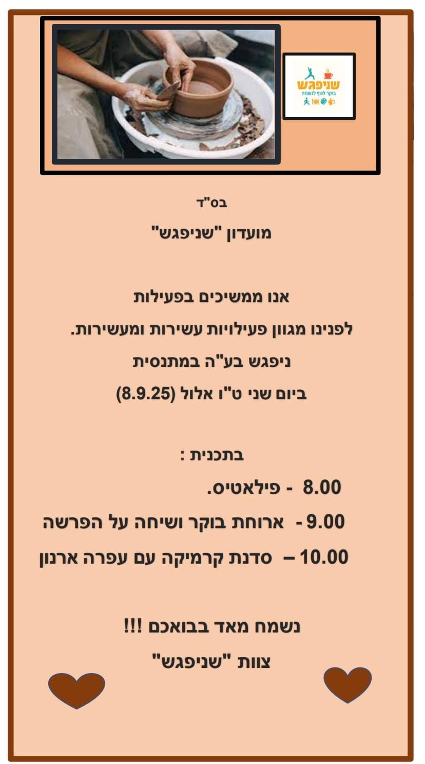 בתוכנית: 8.00 – אימון פילאטיס 9.00- ארוחת בוקר ודברי תורה על פרשת השבוע. 10.00 – סדנת קרמיקה עם עפרה ארנון. מי שמעוניין להשתתף בסדנת הקרמיקה מתבקש להירשם אצל ברכה קלינגל. ניפגש בשמחה בע"ה