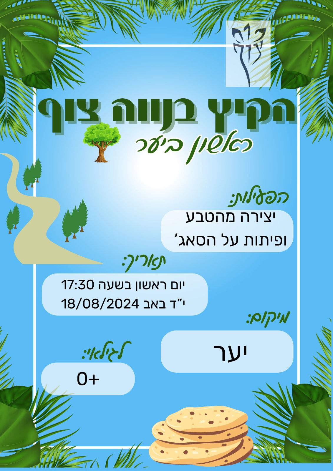 פעילות ראשון ביער🌲🧺 – ביום ראשון הקרוב בשעה 17:30, ניפגש בקרחת היער לאחר הצהריים משותפים. מומלץ להביא מחצלת וארוחת ערב. נכין פיתות על הסאג' ונאכל יחד.