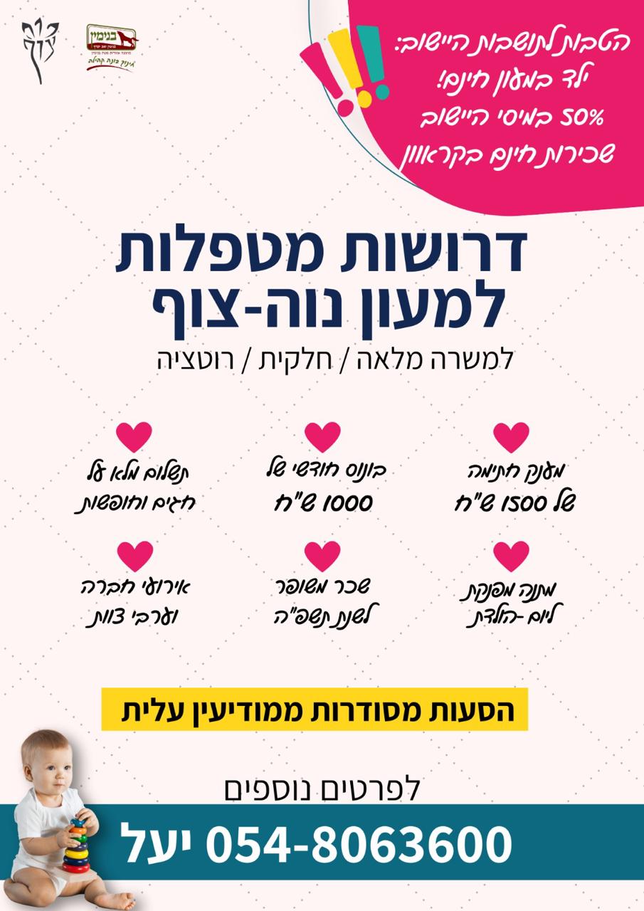 נשמח שתפיצו את הפלאיירים עם המודעה המצורפת ועזרו לנו להביא מטפלות וסייעות טובות ליישוב שלנו😊