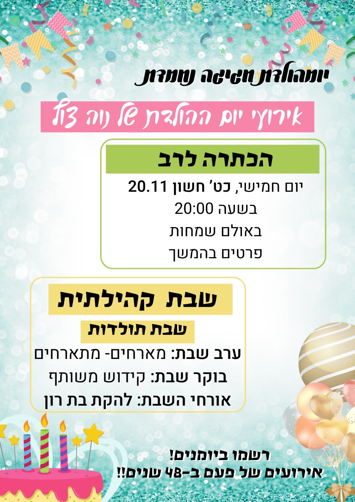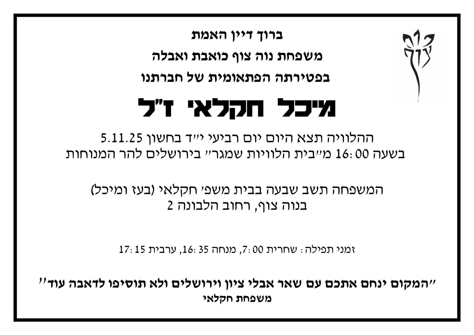 דחיית הקידוש ליובלים משבת פרשת וירא לשבת פרשת חיי שרה- חברי יובלים כואבים ומצטערים על פטירתה בטרם עת של חברתנו מיכל חקלאי ע"ה ומשתתפים בצער המשפחה. בשל הצער והאבל על פטירת חברתנו נדחה הקידוש שהיה אמור להתקיים בשבת זו לשבת הבאה פר' חיי שרה.