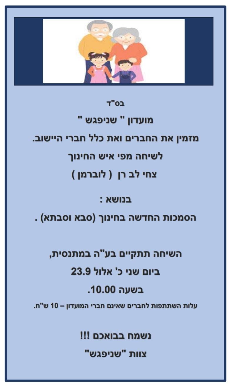 ביום שני הבא כ' באלול 23.9, נשמע שיחה מפי צחי לב רן (לוברמן) שגדל ביישוב וכיום הוא איש חינוך מוערך ביותר, בנושא: "הסמכות החדשה בחינוך". (מעורבות הסבא והסבתא בחינוך הנכדים).