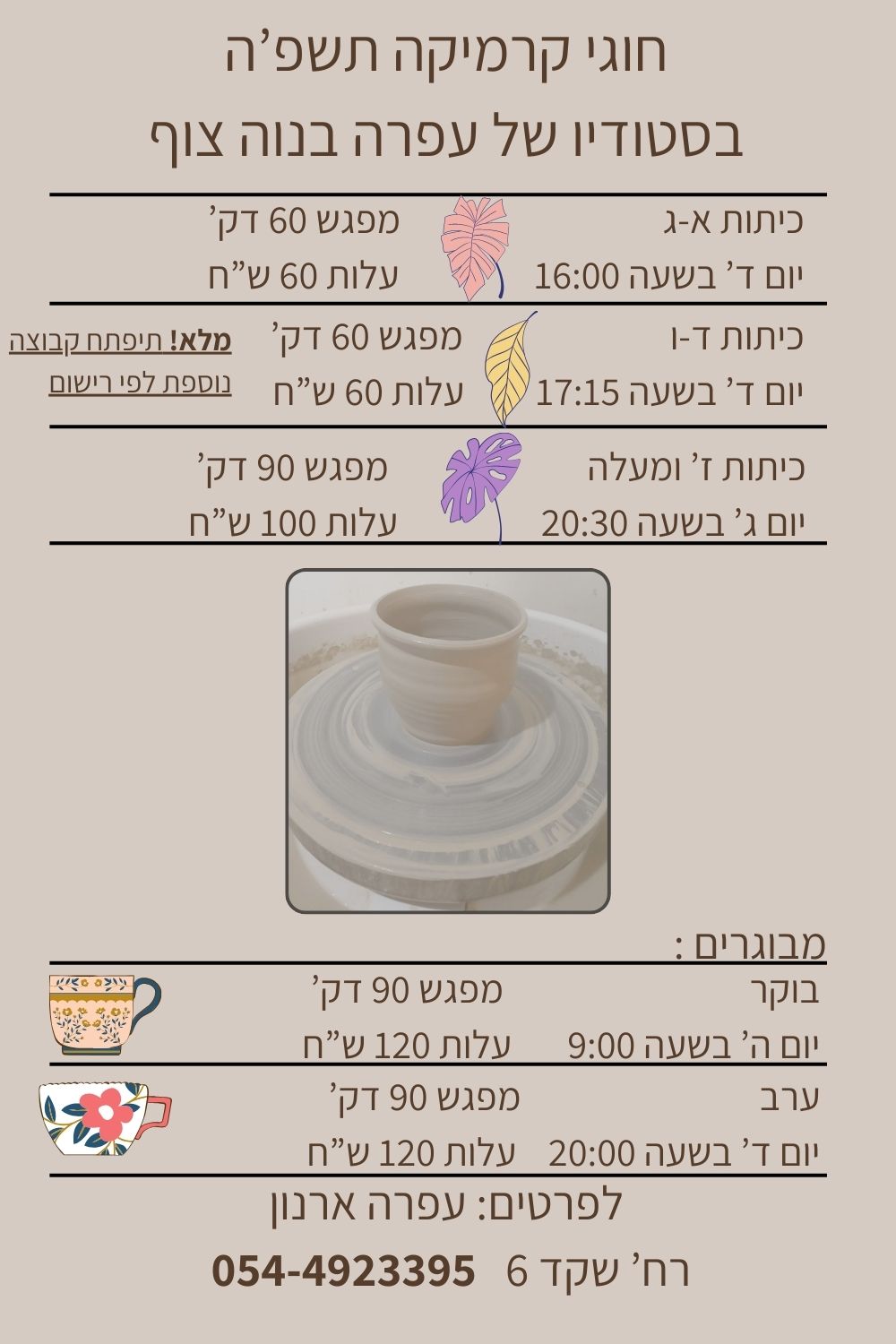 ההרשמה אצל רחל לוברמן בווטצאפ או בהודעת טקסט, ולא בטלפון, כדי שיהיה רישום. אפשר כמובן גם להתקשר אל רחל כדי לברר פרטים.