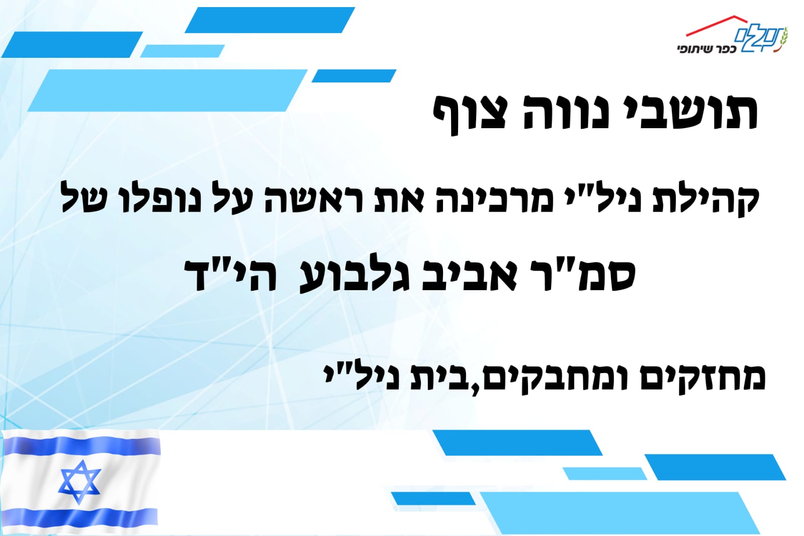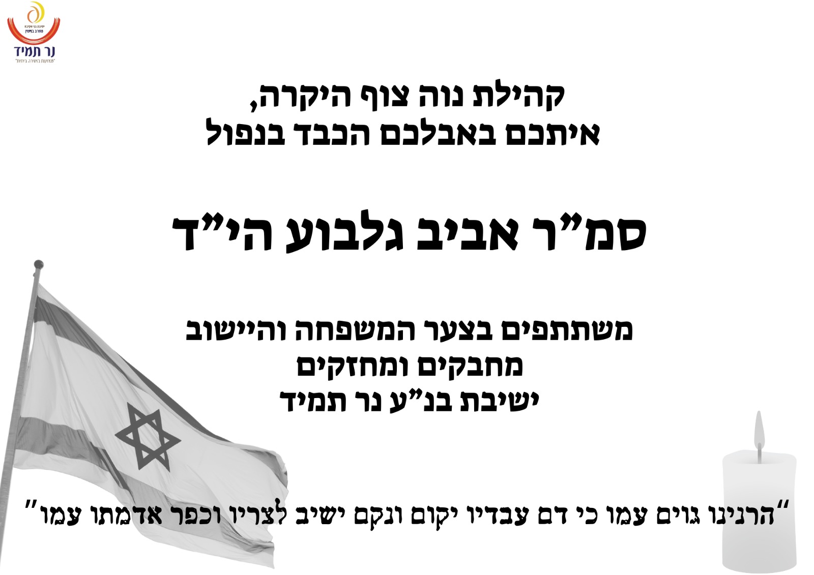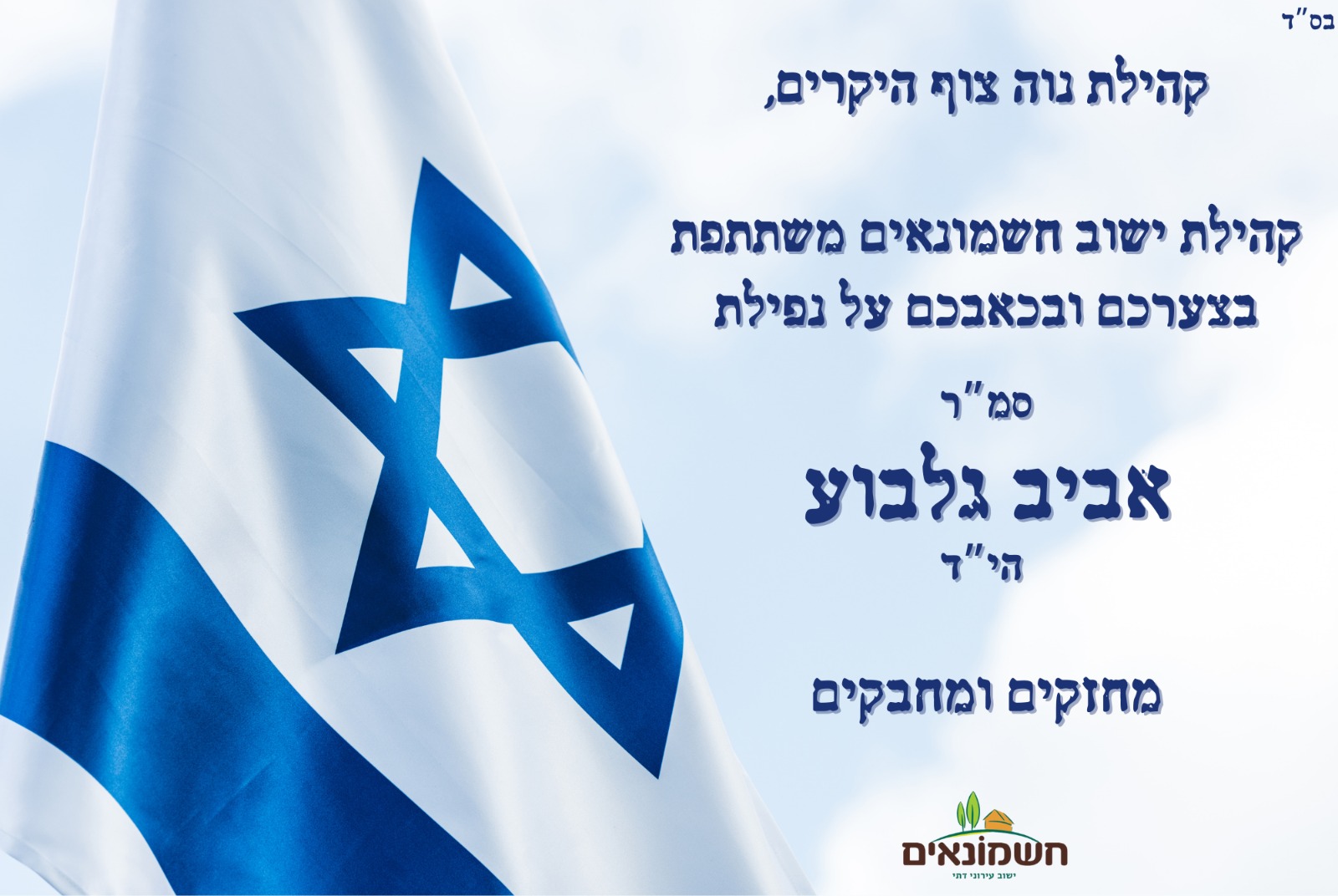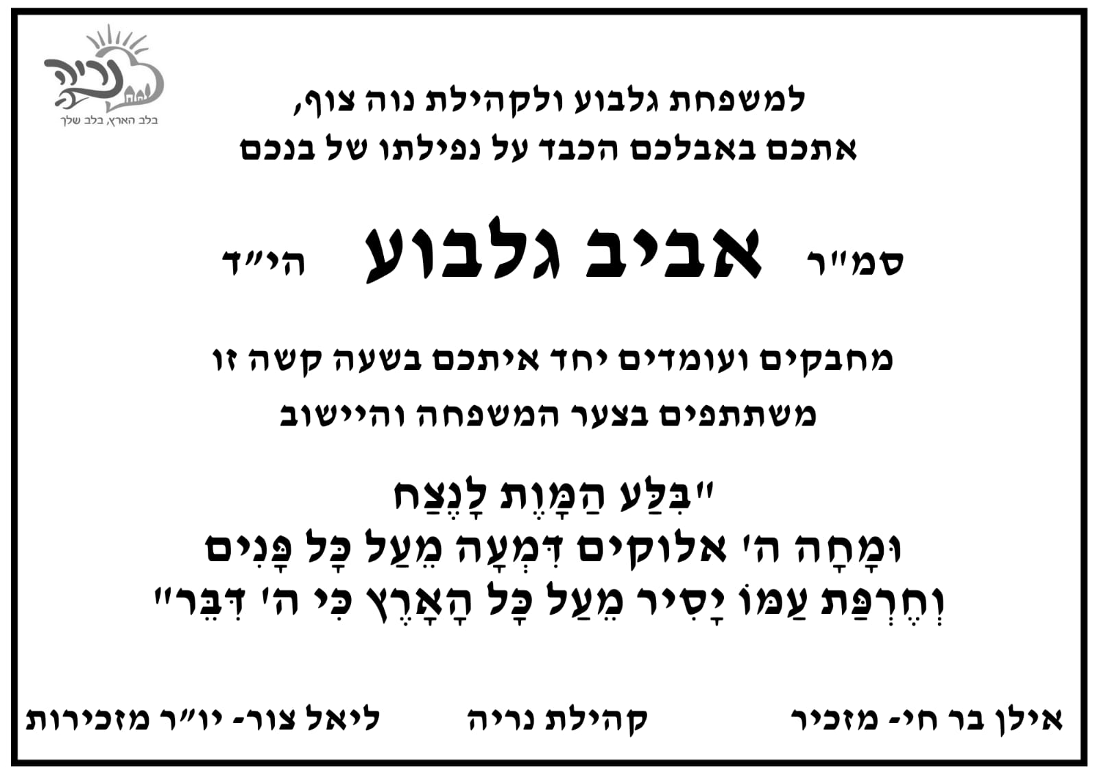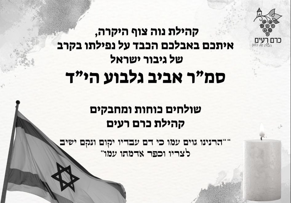 בצער רב, השבוע קיבלנו את הבשורה המרה על נפילתו של בן היישוב אביב גלבוע הי"ד. צוות היישוב פעל מיד לסייע למשפחה ולתמוך בהם בשעה קשה זו. תודה לרב זאב מוק, יו"ר צח"י, ולרעות רכזת הקהילה על ניהול התהליך באחריות וברגישות.