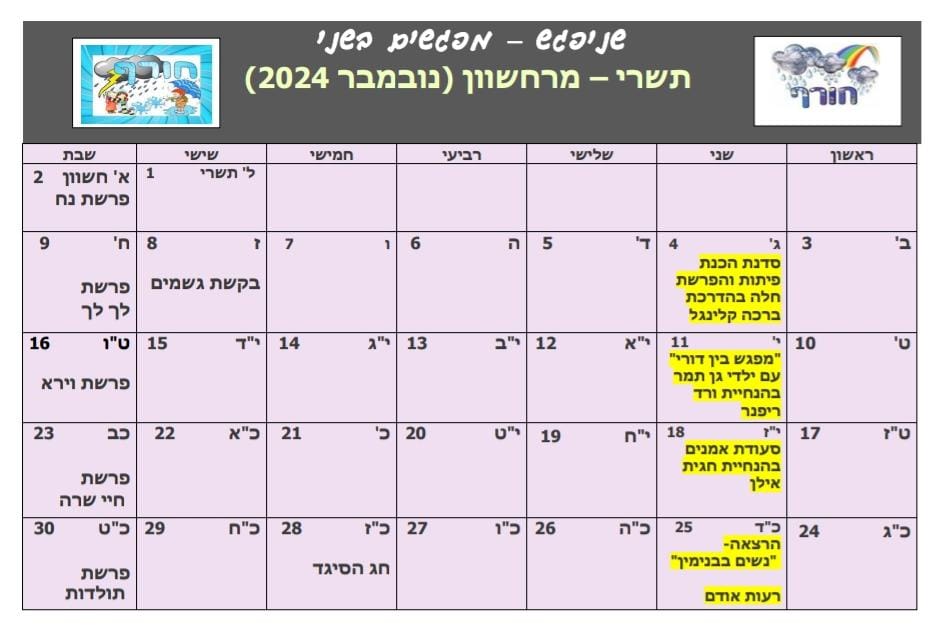 ג' חשוון (4.11), בתכנית: 7:45 פילאטיס, 8:30 סדנה להכנת פיתות, נכין בצק, נעשה הפרשת חלה להצלחת חיילי צה"ל, להחלמת הפצועים ולהשבת החטופים.