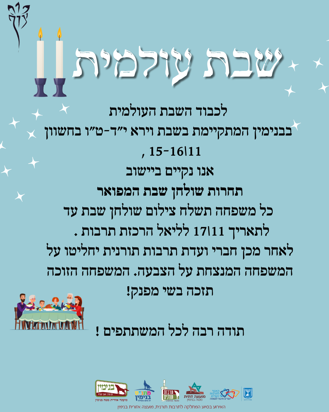 • תחרות שולחן השבת +חוברת מתכונים יישובית לשבת קודש🍷לכבוד השבת העולמית בבנימין המתקיימת בשבת וירא י״ד-ט״ו בחשוון 15-16/11 , אנחנו יוצרים חוברת מתכונים לשבת קודש של תושבי היישוב. החוברות יחולקו ביחד עם מגנט סדר הפרשת חלה בדואר בסוף השבוע 🙌 בנוסף בסוף השבוע מתקיים ביישוב תחרות שולחן שבת המפואר, כל משפחה תשלח צילום שולחן שבת עד לתאריך 17/11 לליאל הרכזת תרבות. לאחר מכן חברי ועדת תרבות תורנית יחליטו על המשפחה המנצחת בהצבעה. המשפחה הזוכה תזכה בשי מפנק!🎁