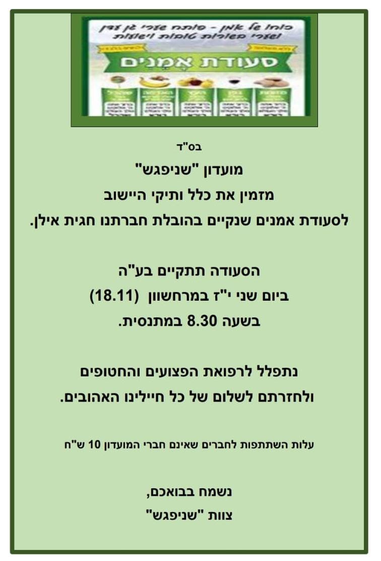 ביום שני י"ז בחשוון נמשיך בפעילות השוטפת: לאחר חוג פילאטיס נקיים בשעה 8.30 סעודת אמנים בהנחיית חברתנו חגית אילן. נתפלל לרפואת הפצועים, לשובם של החטופים לשלומם של חיילינו האהובים. נשמח להשתתפות כלל וותיקי הישוב.