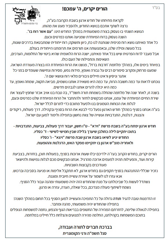 אנחנו בפתחו של חודש ארגון בנושא "עם אשר רוח בו". בע"ה מאחלת שנצליח לגלות בנו את הרוח, להוציא אותה לפועל למען עמנו, למען ארצנו. השבוע נפגשנו צוות נחשון וצוות הדרכה לישב"צים כדי להכין לכם את החודש ארגון המטורףף שהולך להיות!! יהיו בו פעולות, צביעת קירות, התנדבויות והופעות מדהימות. מצורף מכתב להורים לקראת חודש ארגון.