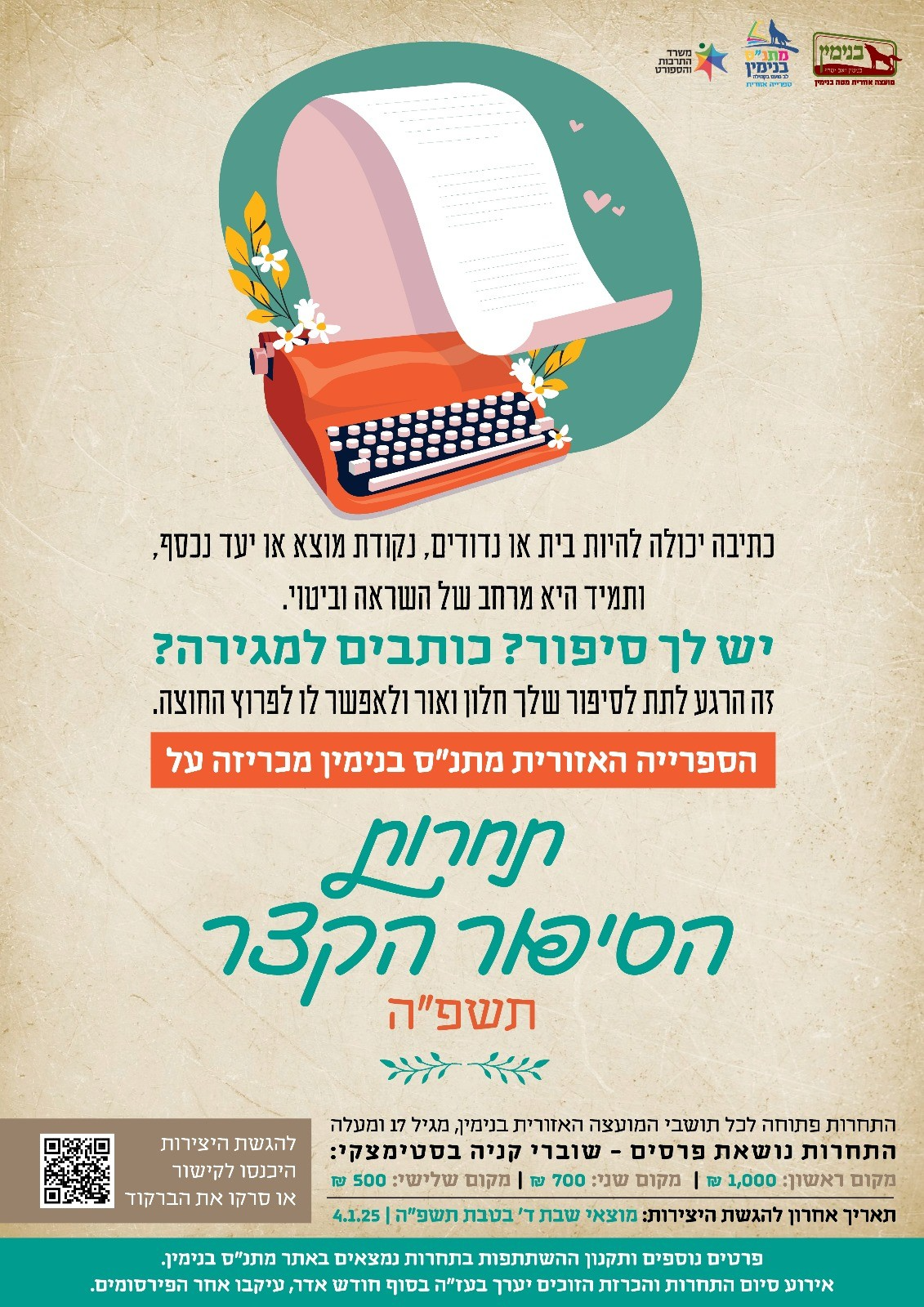 יש לכם סיפור? כותבים למגירה? זה הזמן להוציא את הסיפור שלכם לאור! 📚 התחרות פתוחה לתושבי בנימין מגיל 17 ומעלה. לפרטים נוספים, תקנון התחרות ולהגשת הסיפורים, היכנסו לקישור