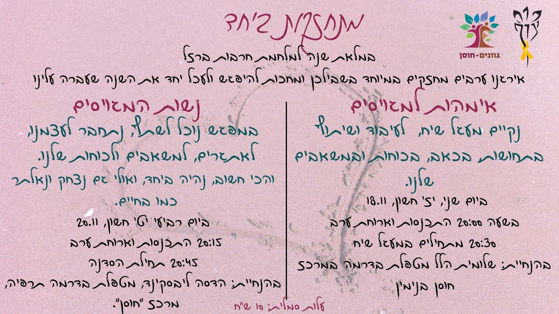 • מתחזקות ביחד- במלאת שנה למלחמת חרבות ברזל ארגנו ערבים מחזקים במיוחד בשבילכן ומחכות להיפגש ולעכל יחד את השנה שעברה עלינו. אימהות למגויסים- נקיים מעגל שיח לעיבוד ושיתוף בתחושות, בכאב, בכוחות ובמשאבים שלנו. ביום שני, יז’ חשון, 18.11 בשעה 20:00 התכנסות וארוחת ערב 20:30 מתחילים במעגל שיח בהנחיית: שלומית הלל מטפלת באומנות במרכז חוסן בנימין. נשות המגויסים- במפגש נוכל לשתף, נתחבר לעצמנו, לאתגרים, למשאבים ולכוחות שלנו. והכי חשוב, נהיה ביחד, ואולי גם נצחק ונאלתר כמו בחיים.ביום רביעי יט’ חשון, 20.11, בשעה 20:15 התכנסות וארוחת ערב 20:45 תחילת הסדנה בהנחיית: הדסה ליבסקינד, מטפלת בדרמה תרפיה, מרכז "חוסן".