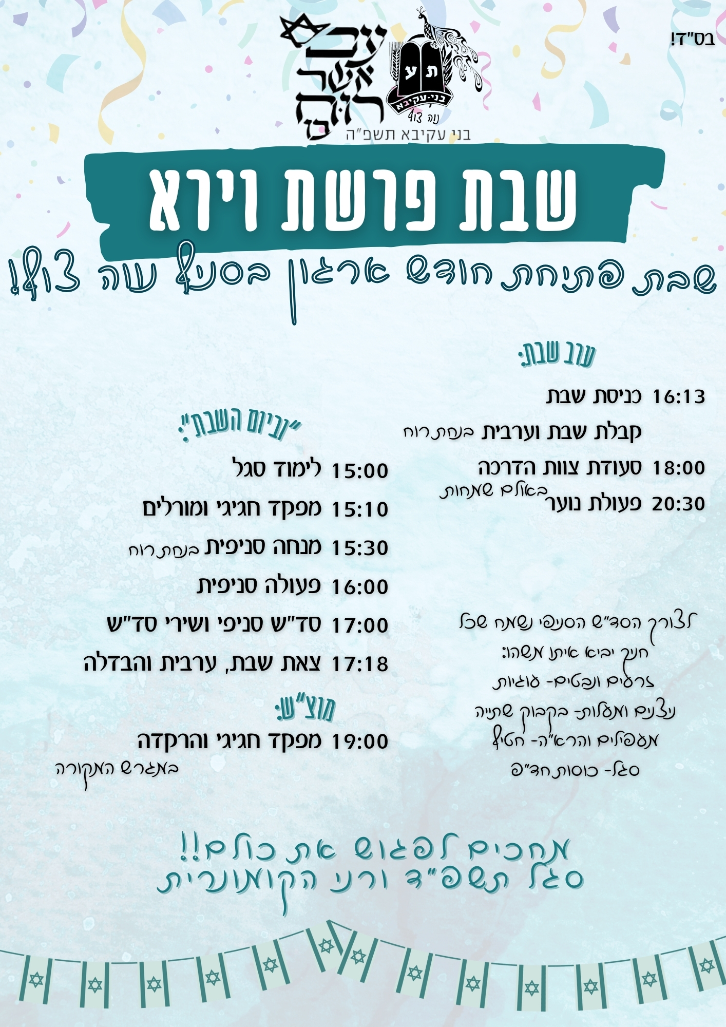 מוצ"ש: 19:00 מפקד חגיגי והרקדה במגרש המקורה