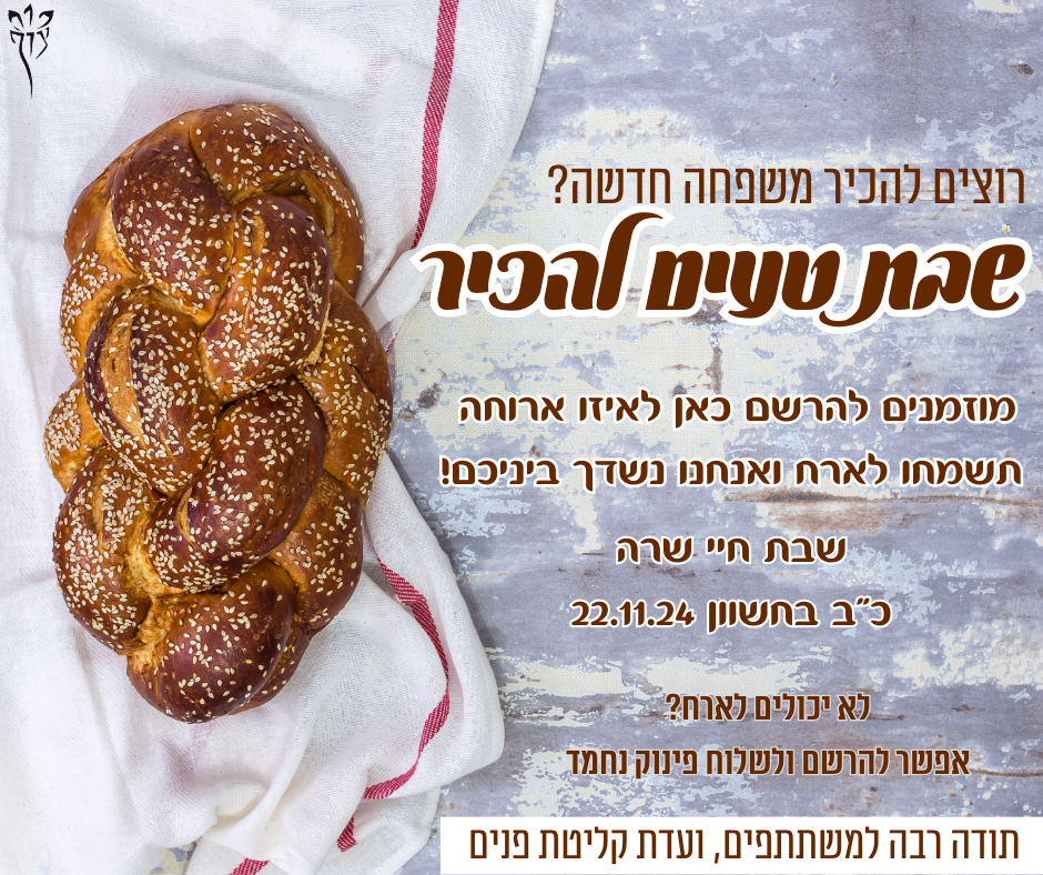 בשבת חיי שרה כ״ב בחשוון 22/11/24 נקיים ביישוב שבת טעים להכיר, שבת שמשפחות מארחות משפחות חדשות בכדי לייצר הכרות וגיבוש יישובי.