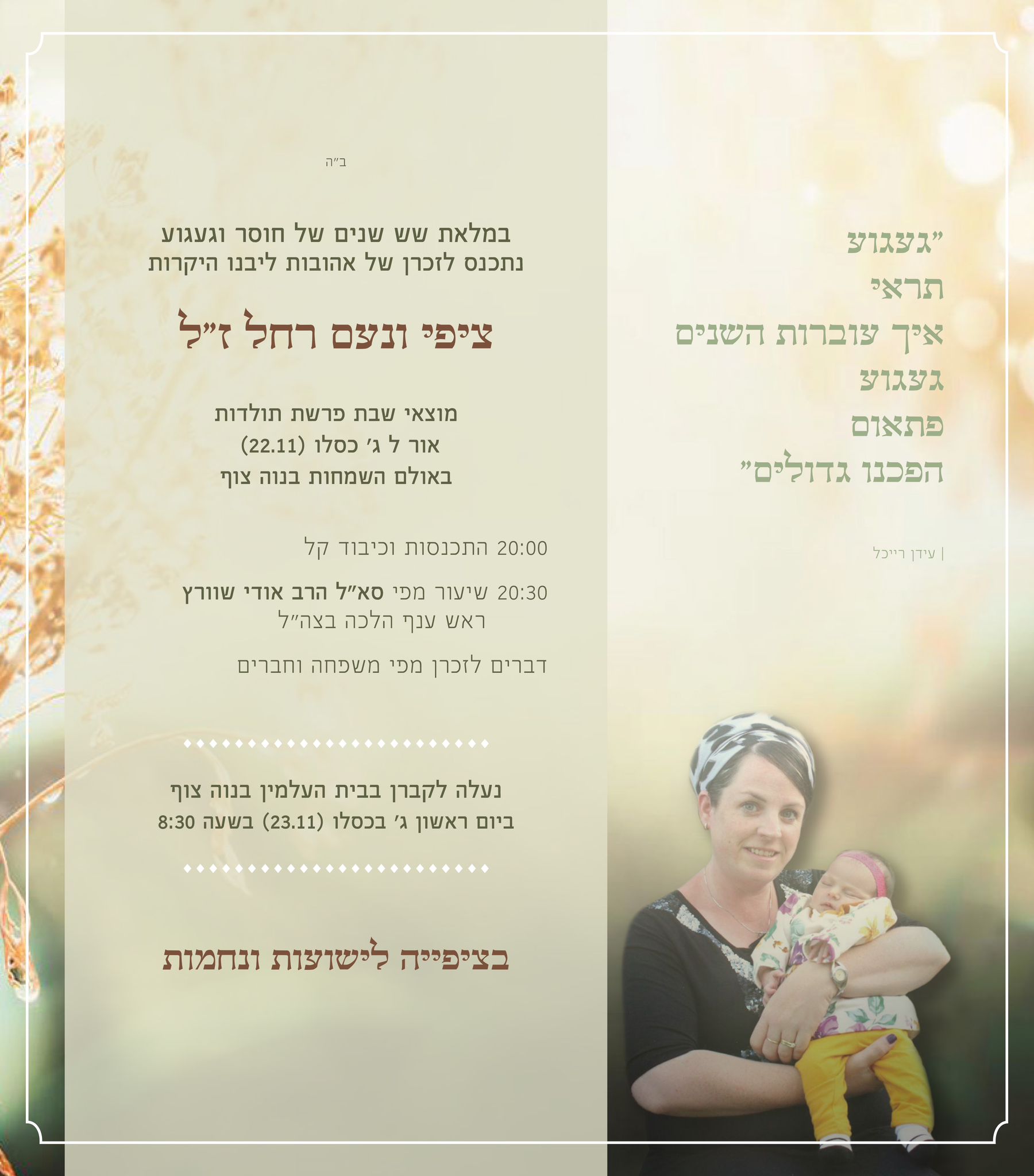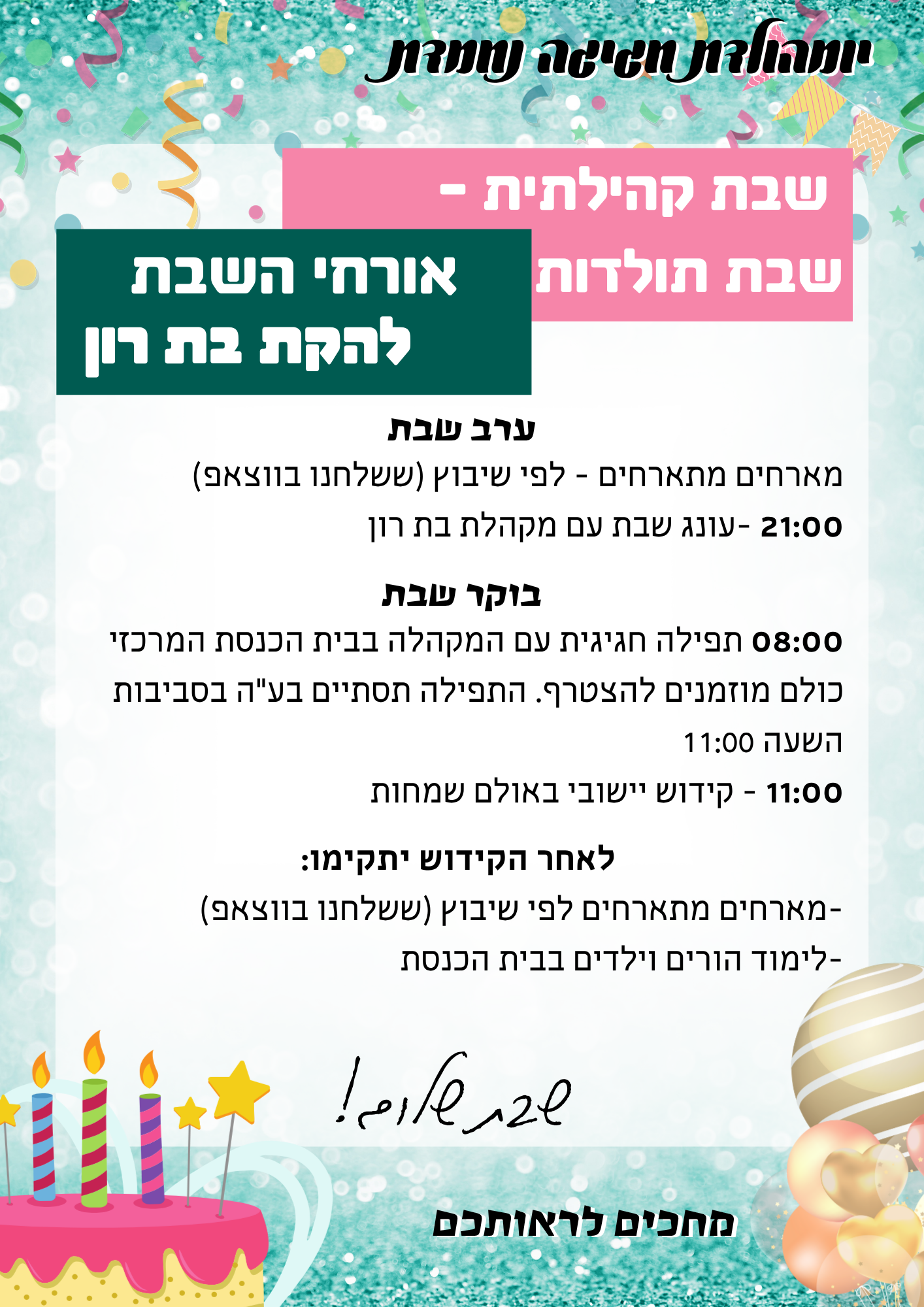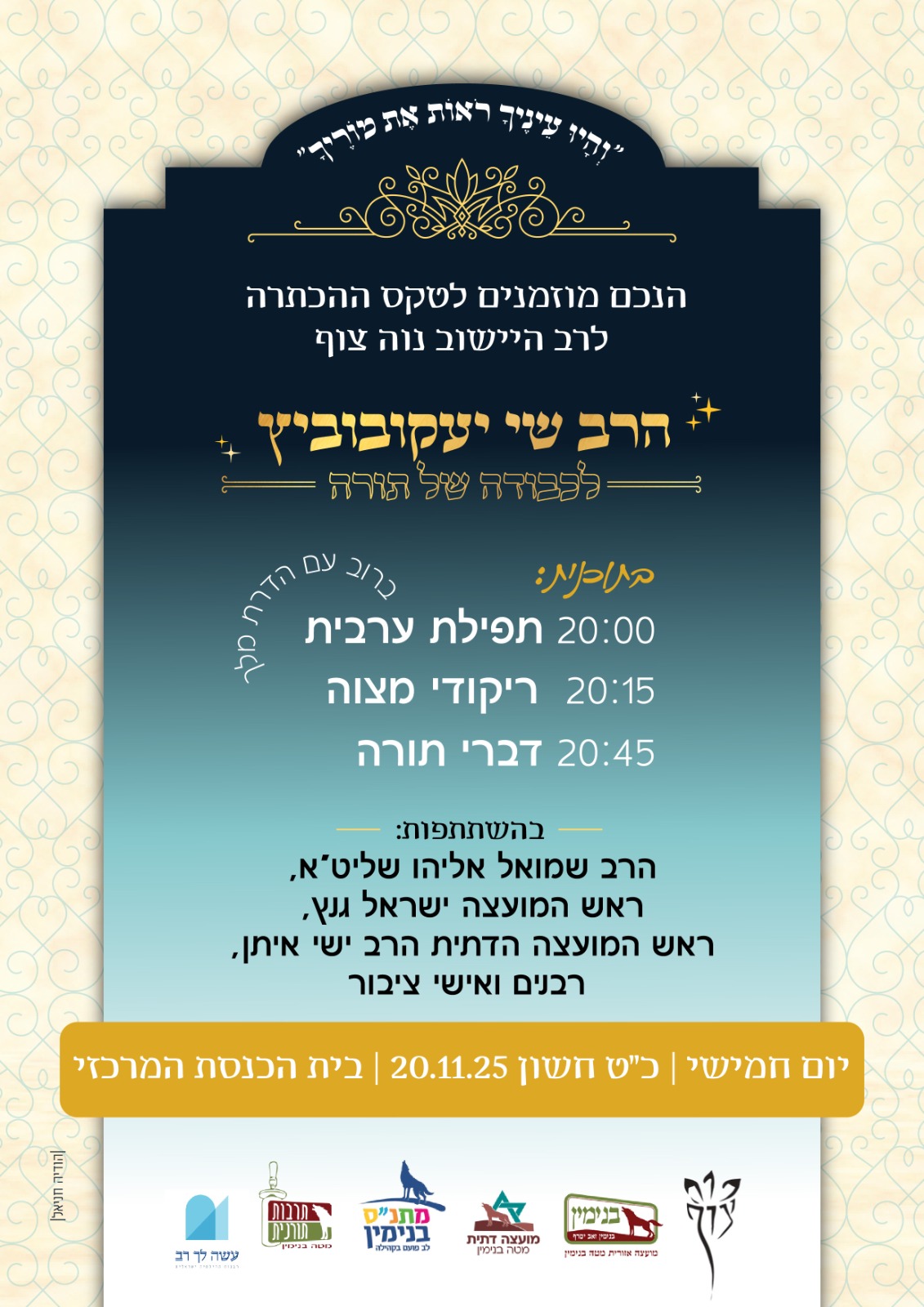 קידוש ליובלים בשבת פרשת חיי שרה- בשבת זו, פרשת חיי שרה כ"ד בחשוון, 15.11.25 בשעה 10:15 נתכנס כולנו, חברי יובלים, לקידוש באולם השמחות לרגל 48 שנות הישוב ולרגל חודש האזרח הוותיק. כל חברי יובלים מוזמנים, גם אם לא השתבצו מראש בטבלאות. נתכנס בשעה 10.15 באולם השמחות הקידוש בשעה 10.30. קבענו את השעה כך שתתאים למתפללים בכל בתי הכנסת מתוך רצון לפגוש את כולם בקידוש. להתראות בקידוש! וועדת יובלים