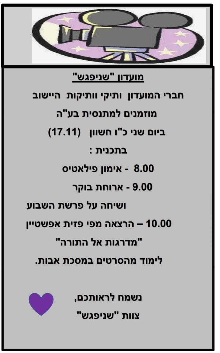 ותיקים וותיקות הישוב מוזמנים להשתתף בפעילויות המגוונות של המועדון. נשמח מאד בבואכם. ❤️
