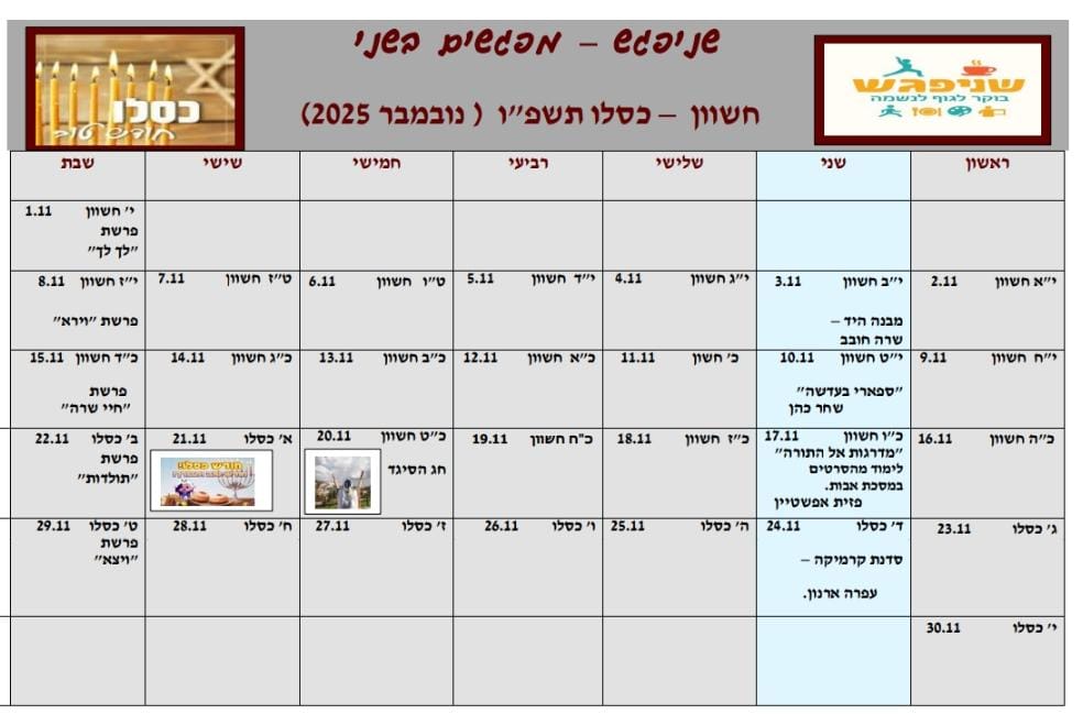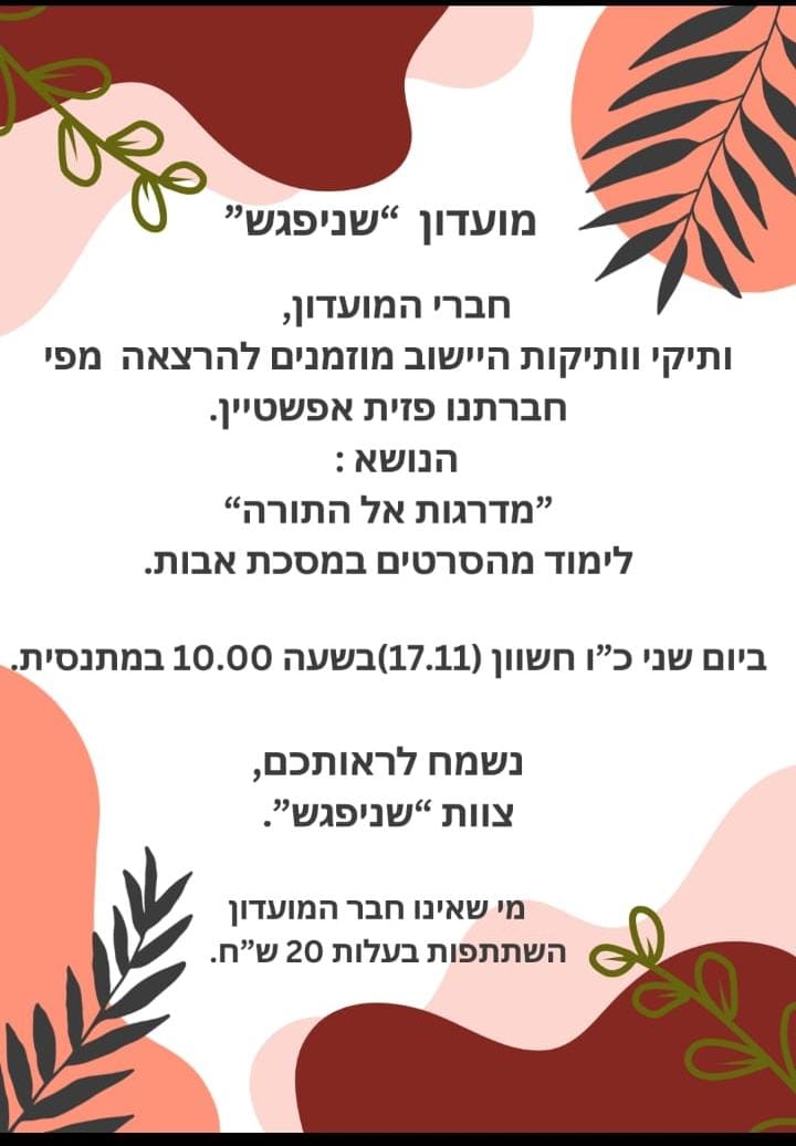 מה שצפוי לנו: ניפגש בע"ה ביום שני כ"ו בחשוון (17.11). סדר היום: 8.00 – פילאטיס, 9.00- ארוחת בוקר ושיחה על פרשת השבוע, 10.00- הרצאה מפי פזית אפשטיין בנושא:"מדרגות אל התורה" –