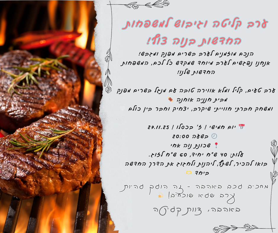 הנכם מוזמנים לערב בשרים מפנק ומגבש! אנחנו נפגשים לערב מיוחד שמוקדש כולו לכם, המשפחות החדשות שלנו! ערב טעים, קליל ומלא אווירה טובה – עם מנגל בשרים מפנק מבית חנניה אוחנה🍖 ומשחק חברתי חווייתי שיקרב, יצחיק ויחבר בין כולם 🤍📅 יום חמישי | ז׳ בכסלו | 27.11.25 🕗 בשעה 20:00📍 שכונת נוה אחי 🎟️ עלות: 40 ש”ח יחיד, 60 ש”ח לזוג. להרשמה לחצו כאן!בואו להכיר, לשתף, ליהנות ולחגוג את הדרך החדשה ביחד 🫶 מחכים לכם באהבה – זה הולך להיות ערב שלא שוכחים! באהבה, צוות קליטה