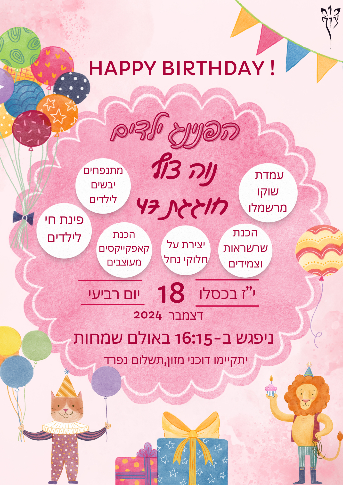 ביום רביעי י״ז בכסלו 18/12 ניפגש בשעה 16:15 באולם שמחות להפנינג יום הולדת מטורף!!