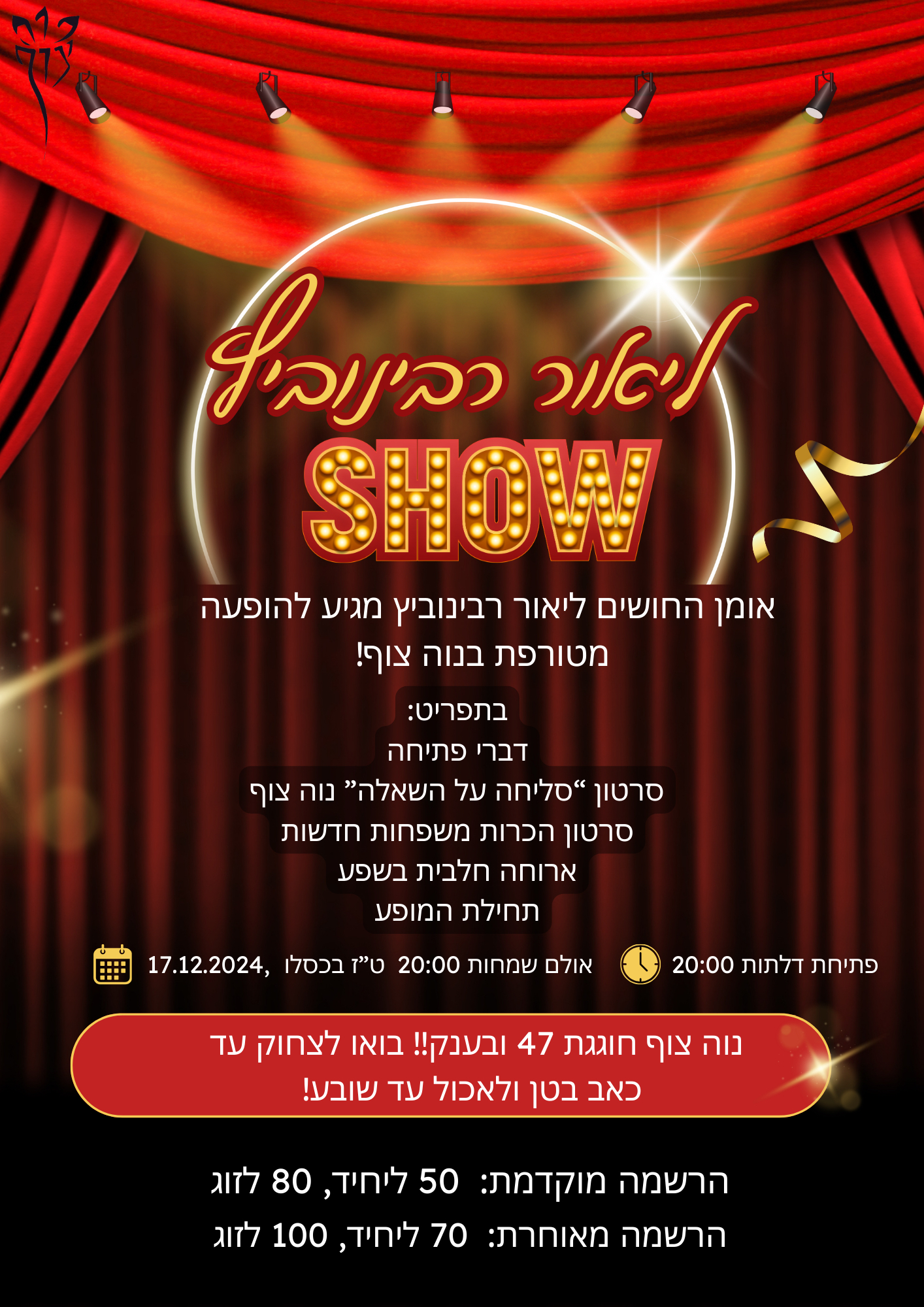 עלות: בהרשמה מוקדמת עד לתאריך ט' כסליו, 10.12 היא 50 ליחיד, 80 לזוג. לאחר תאריך זה העלות היא 70 ליחיד, 100 לזוג. ניתן לבטל עד לתאריך: יום שלישי, ט' כסליו, 10.12