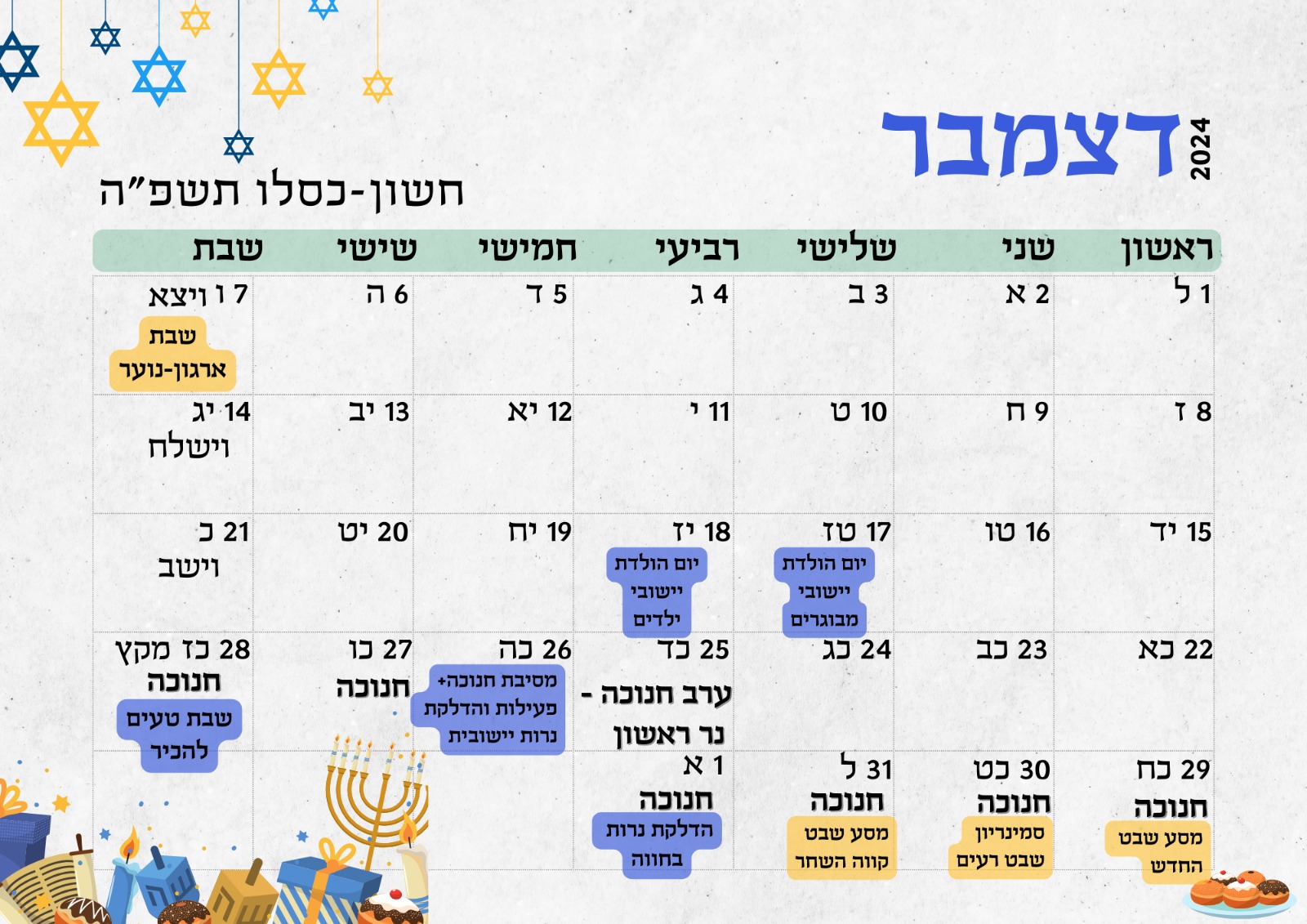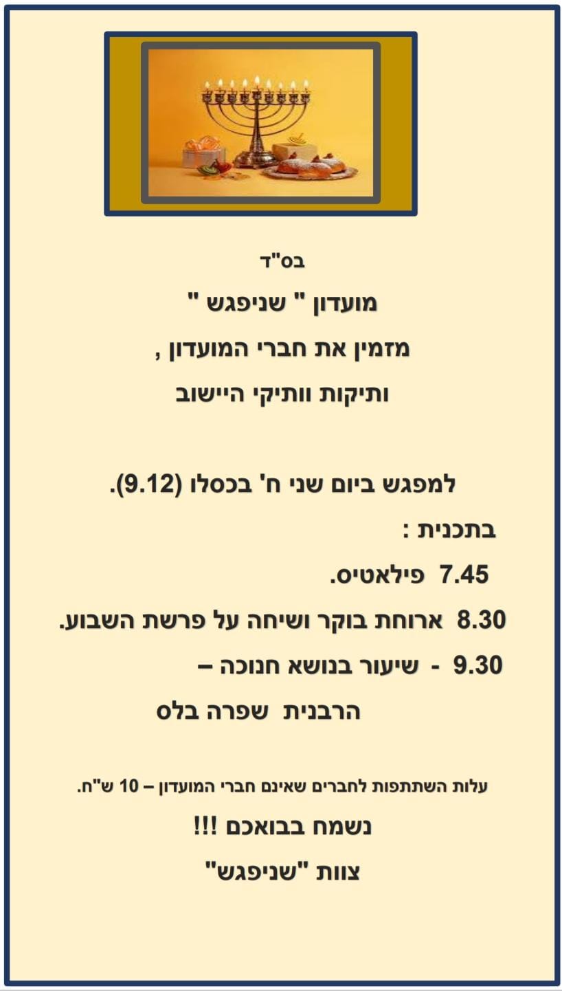 • הדלקת נרות יישובית ופעילות חנוכה! ביום חמישי כ״ה בכסלו 26/12/24 ניפגש ברחבת בית הכנסת המרכזית בשעה 17:00,