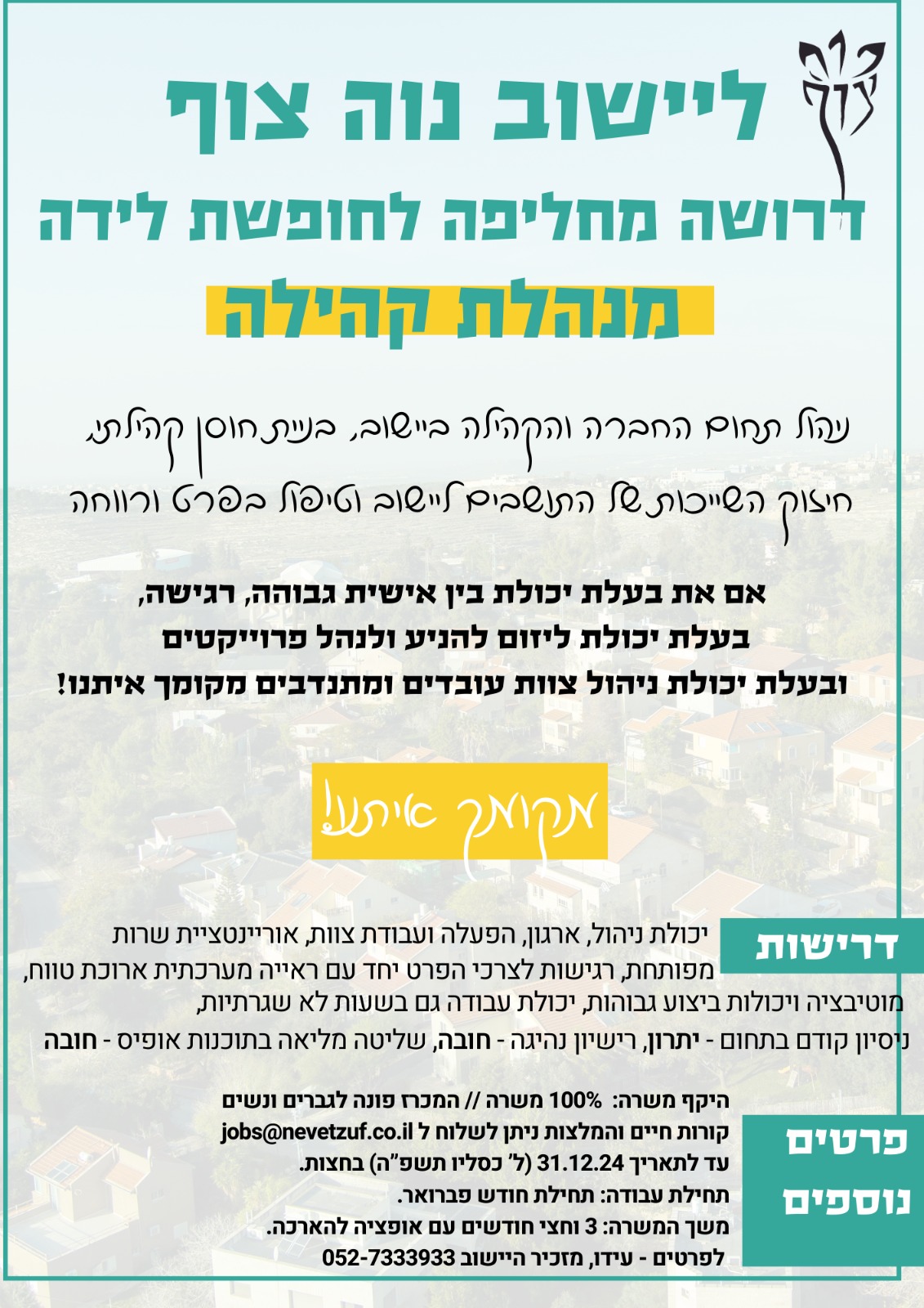 טלפונים חשובים: משרדי היישוב 08-9243843, [email protected], ווצאפ: 052-5666951 | מזכיר היישוב – עידו 052-7333933