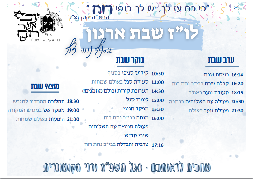 מצורפים כאן במידעצוף לו"ז שבת ארגון והזמנה לאירועי מוצ"ש.