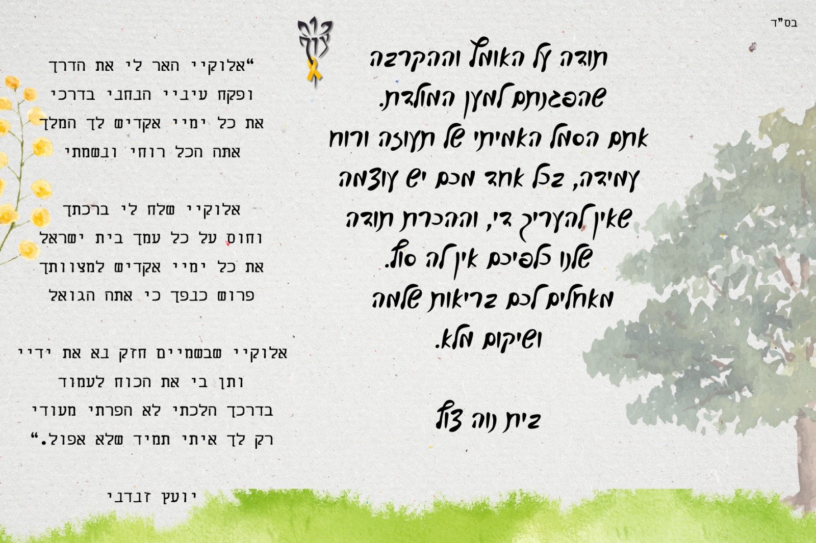 בוקר לימוד מוקדש לעילוי נשמתם של חללינו- יצחק בן עדנה ורפאל, אביב בן נחמה ומעוז, עמר משה בן רעיה ואורן, זאב חנוך (ז'אבו) בן הדסה.