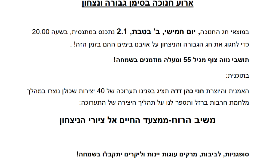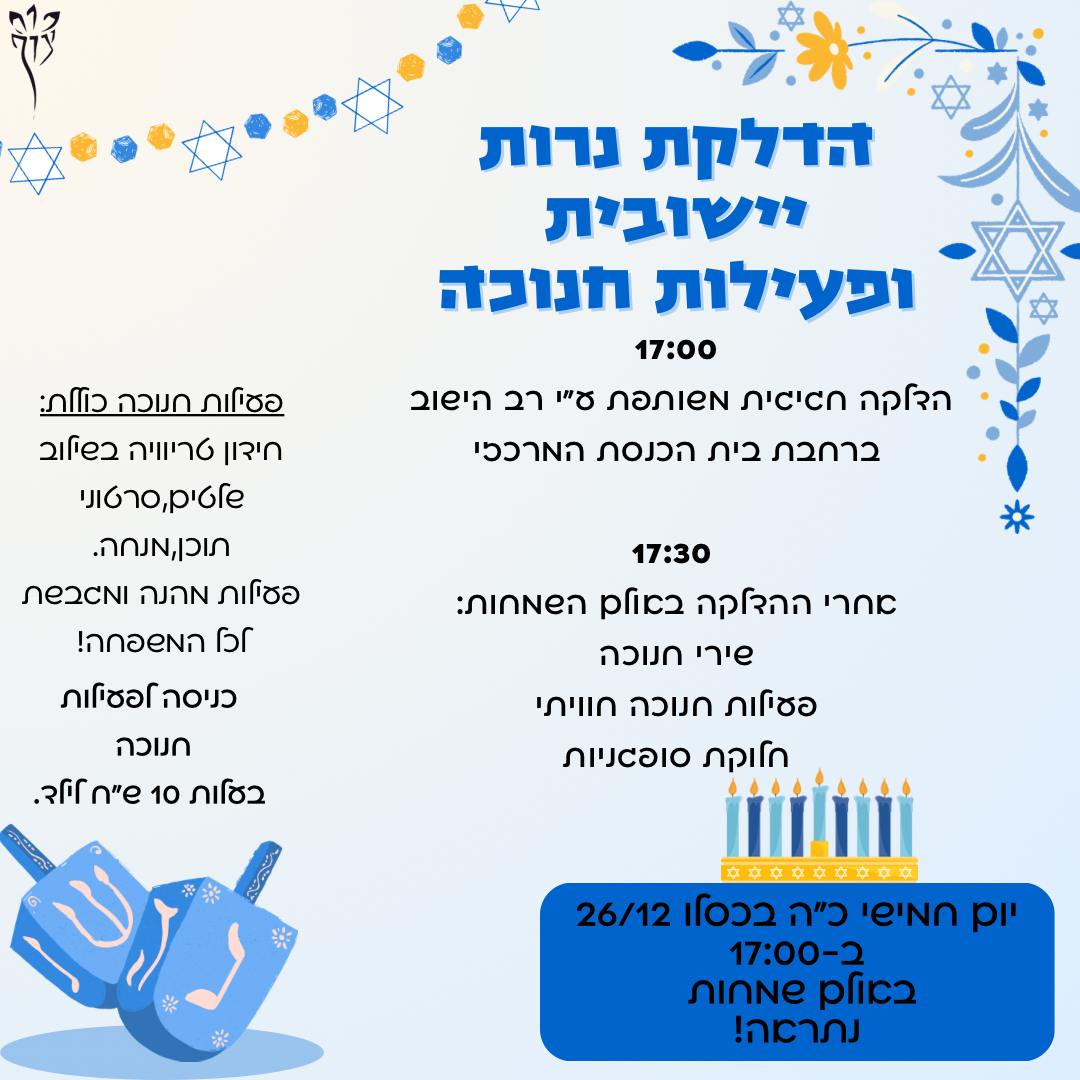 ביום שני כ"ב בכסלו (23.12) ניפגש בשעה 7.45 במתנסית. נתחיל באימון פילאטיס, נמשיך בארוחת בוקר ודברי תורה על הפרשה. בשעה 10.00 נארח את חברתנו רעות אודם, שלכבוד חג החנוכה תתן לנו הרצאה בנושא: "גבורת הרוח והמעשה": סיפורי השראה בתולדות עם ישראל. ההרצאה מיועדת לחברי המועדון, ותיקים וותיקות וכלל חברי היישוב. נשמח בבואכם!