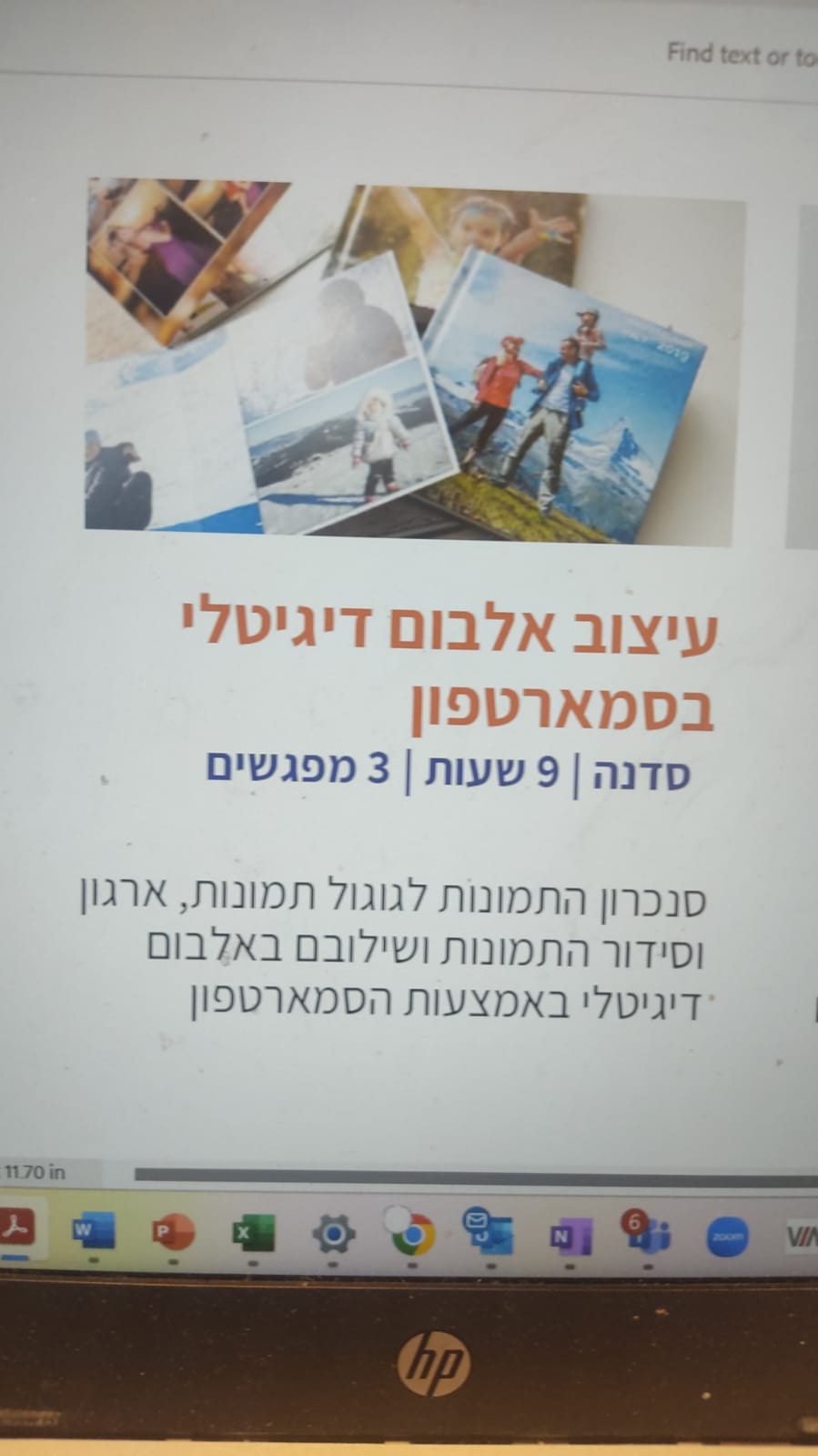 יובלים יקרים, מוסיפים למגוון הפעילויות שלנו: במסגרת "עולים קומה בדיגיטל" ובברכת "ותיקים בקהילה" אנו מעוניינים לפתוח סדנת עריכת אלבום דיגיטלי, במיוחד לחברי יובלים. הסדנה ללא עלות, אך בהרשמה מראש. 3 פגישות של 3 שעות כל אחת, בימי ראשון, בשעה 17:00. הלימוד מתנהל ב"זום". לא צריך לצאת מהבית!!! מתאים במיוחד לימי החורף.. המעוניינים, מוזמנים להירשם בהודעה/ווטסאפ אצל מירי גלסטר.