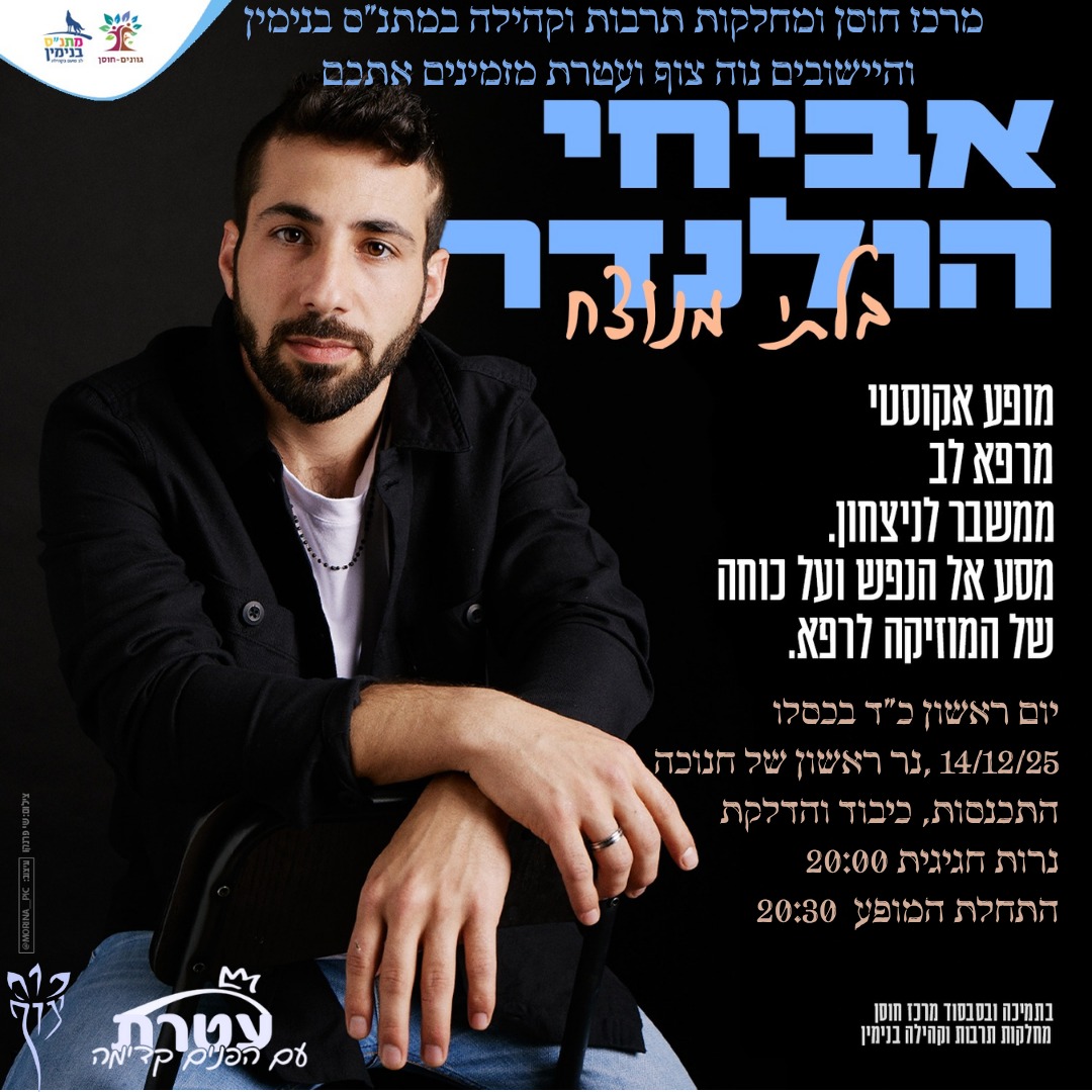 ערב מרגש ועוצמתי – ואתם מוזמנים להיות שם! מרכז חוסן ומחלקות התרבות והקהילה והיישובים עטרת ונוה צוף מזמינים אתכם לערב מיוחד עם: אביחי הולנדר – "בלתי מנוצח" מופע אקוסטי מרפא לב, מסע מהמשבר אל הניצחון, על נפש, התמודדות, כוחות פנימיים והמוזיקה שמרפאת. יום ראשון | כ"ד בכסלו | 14.12.25 בערב הראשון של חנוכה ✨ התכנסות: 20:00 | תחילת המופע: 20:30 . הדלקת נרות חגיגית עם חיילי הפלוגה והמופע המרגש של אביחי הולנדר. באולם השמחות נוה צוף. מיועד לנוער ומעלה, עלות: 30₪ לאדם. ערב שכולו אור, תקווה, ועומק. אל תפספסו! הירשמו כאן! ניפגש ❤️