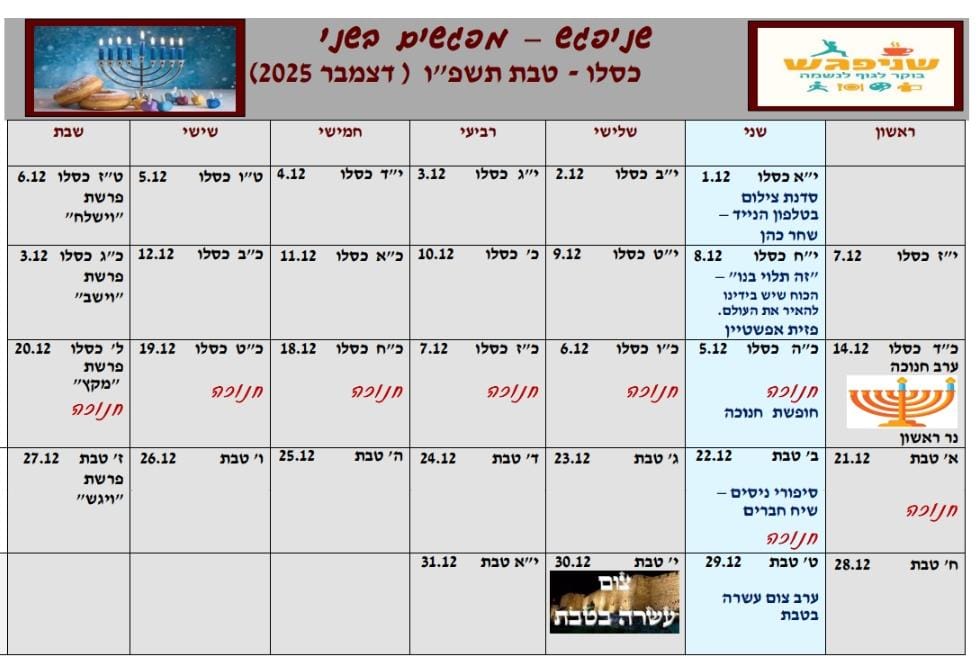 בסוף המידעצוף מצורפת טבלת הפעילויות המתוכננות לחודש כסלו- טבת / דצמבר. נשמח מאד בבואכם,