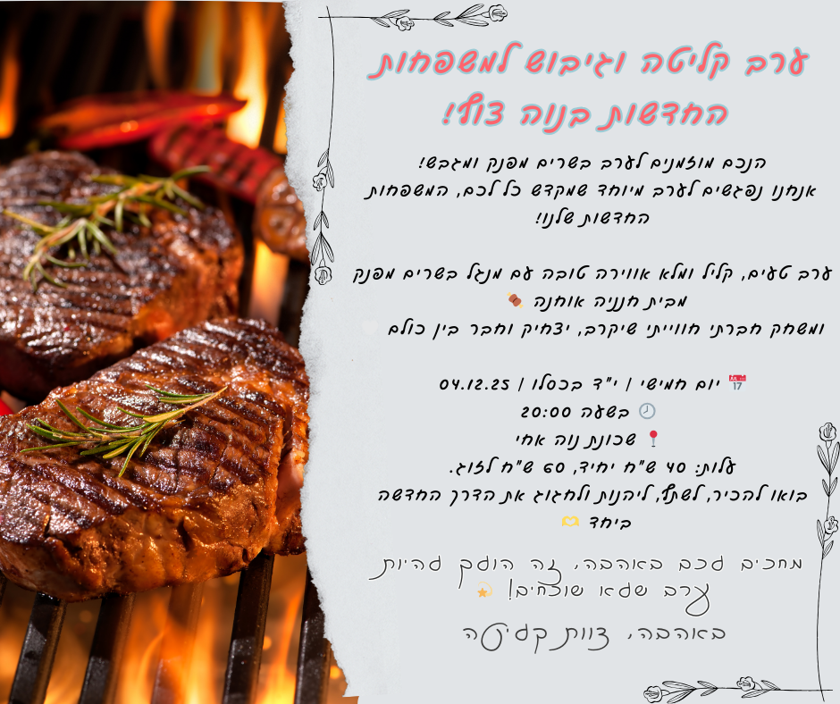 הנכם מוזמנים לערב בשרים מפנק ומגבש! אנחנו נפגשים לערב מיוחד שמקדש כל לכם, המשפחות החדשות שלנו! ערב טעים, קליל ומלא אווירה טובה – עם מנגל בשרים מפנק מבית חנניה אוחנה ומשחק חברתי חווייתי שיקרב, יצחיק וחבר בין כולם. ביום חמישי |י״ד בכסלו | 04.12.25, בשעה 20:00 בשכונת נוה אחי. עלות: 40 ש”ח יחיד, 60 ש”ח לזוג. להרשמה לחצו כאן!