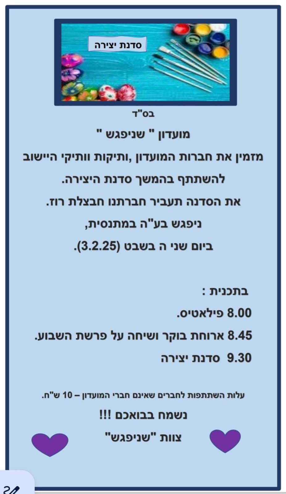ביום שני ה בשבט (3.2) ניפגש בע"ה במתנסית. 8.00 – אימון פילאטיס 8.45 – ארוחת בוקר+ שיחה על פרשת השבוע. 9.30 – המשך סדנת היצירה בהדרכת חברתנו חבצלת רוז. מוזמנים להגיע. חבל להפסיד את החוויה.